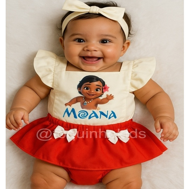 Jardineira romper Bebê menina Moana mêsversario ensaio fotográfico de bebê