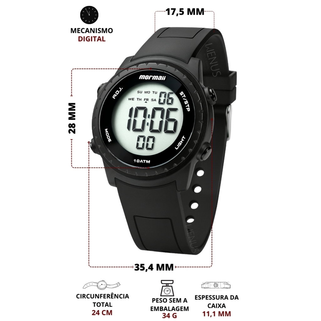 Relógio Mormaii Infantil Digital Unissex Preto Esportivo LCD Positivo Calendário Alarme Prova Água 100 Metros Original