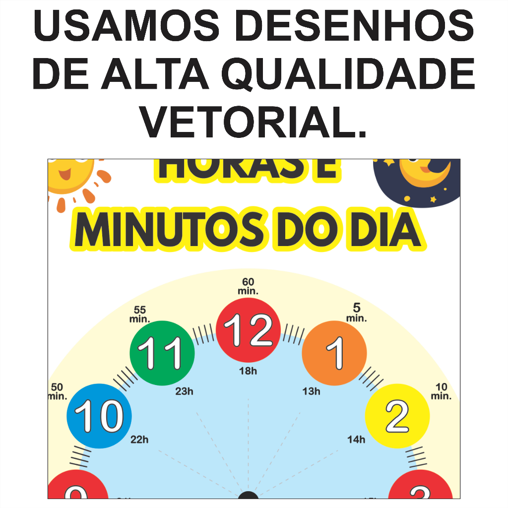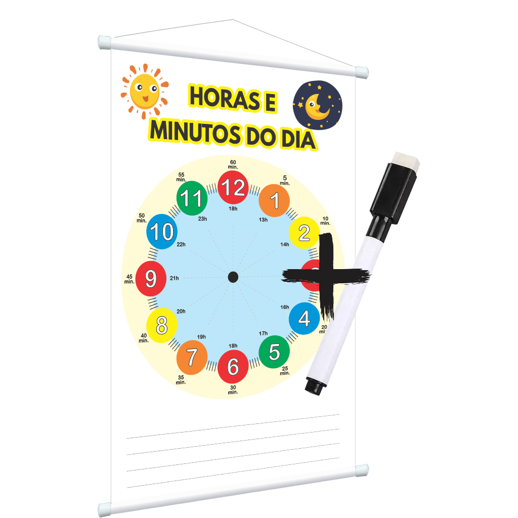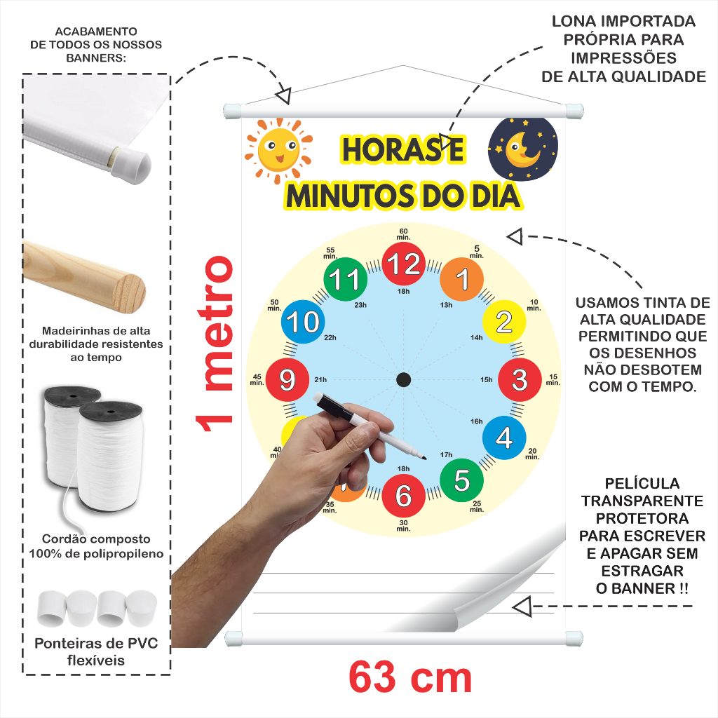 Banner pedagógico plastificado escreve e apaga Horas e minutos do dia