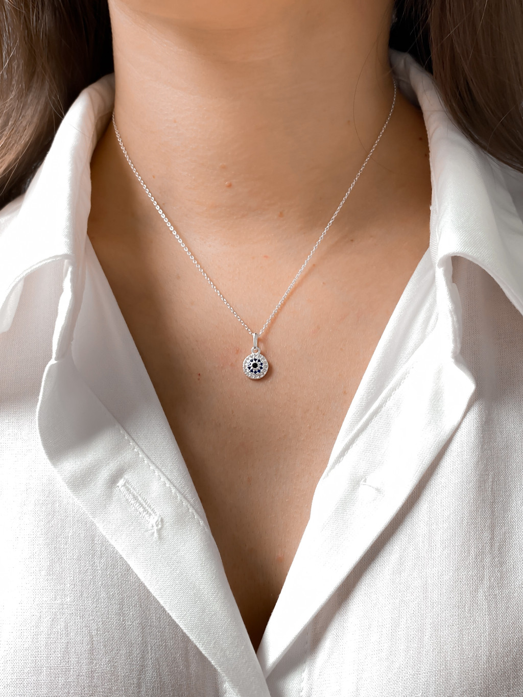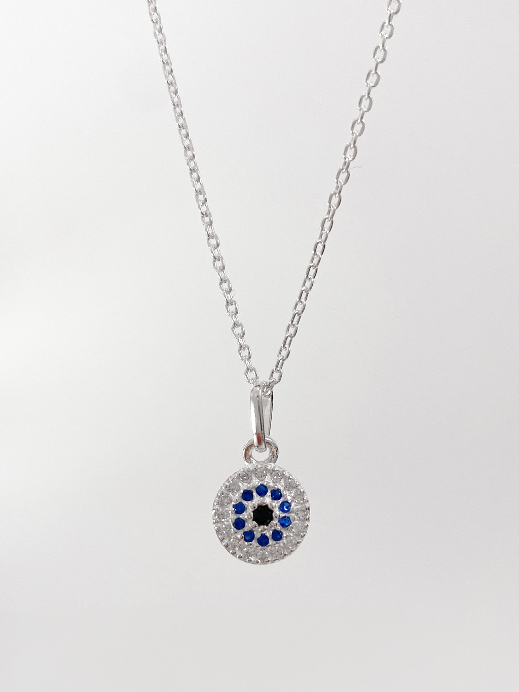 Colar Feminino em Prata 925 Legítima com Pingente de olho grego Cravejado com Zircônias corrente cadeado fina