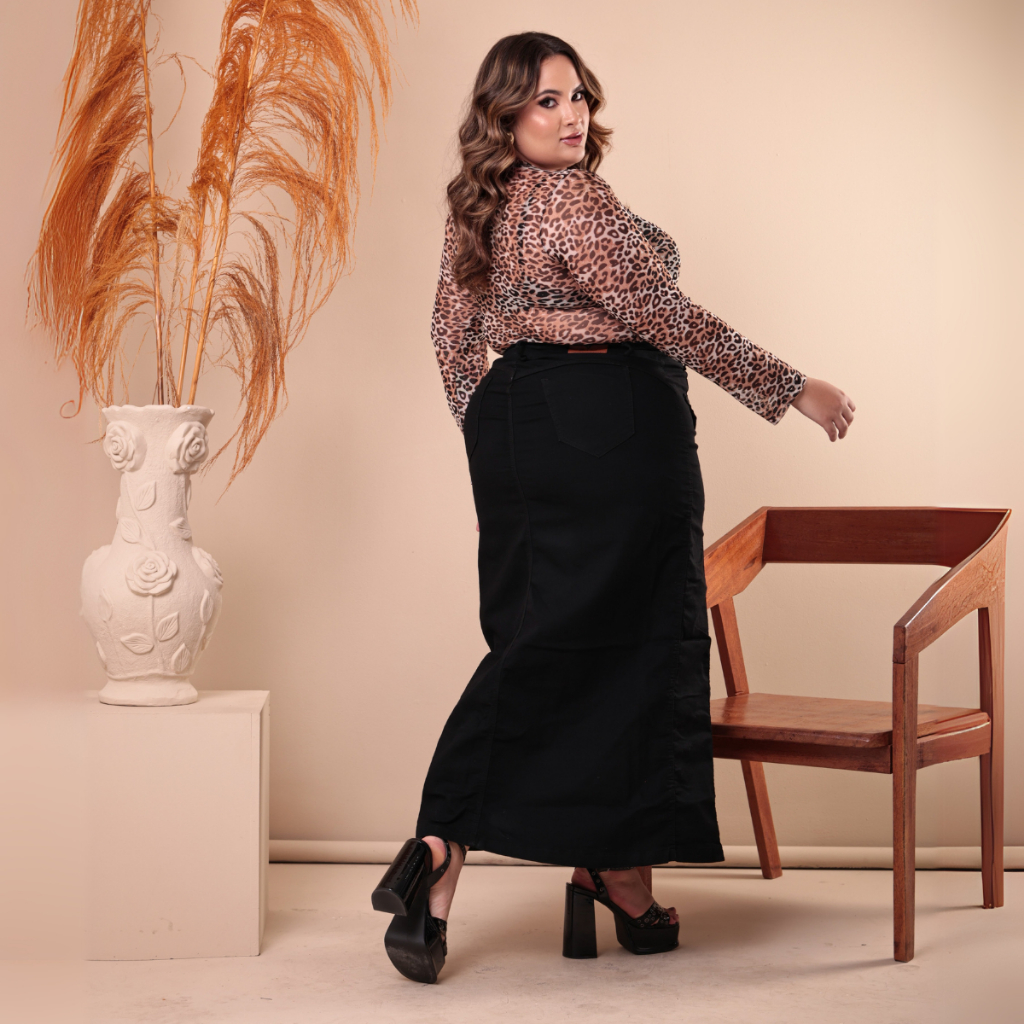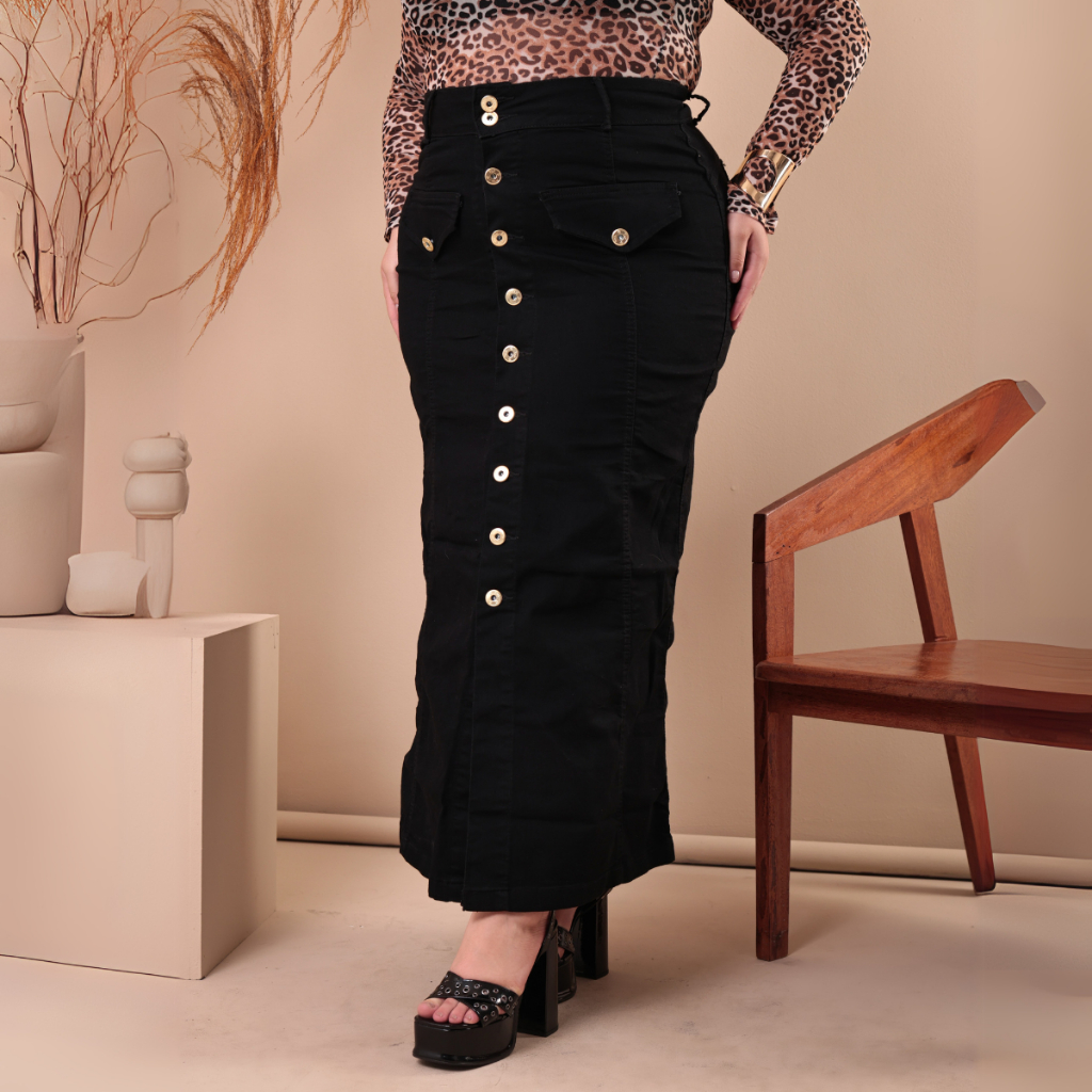 Saia Jeans Longa Preto Evangelica Plus Size Com Lycra Cintura Alta Roupas Femininas Grande 48 a 56