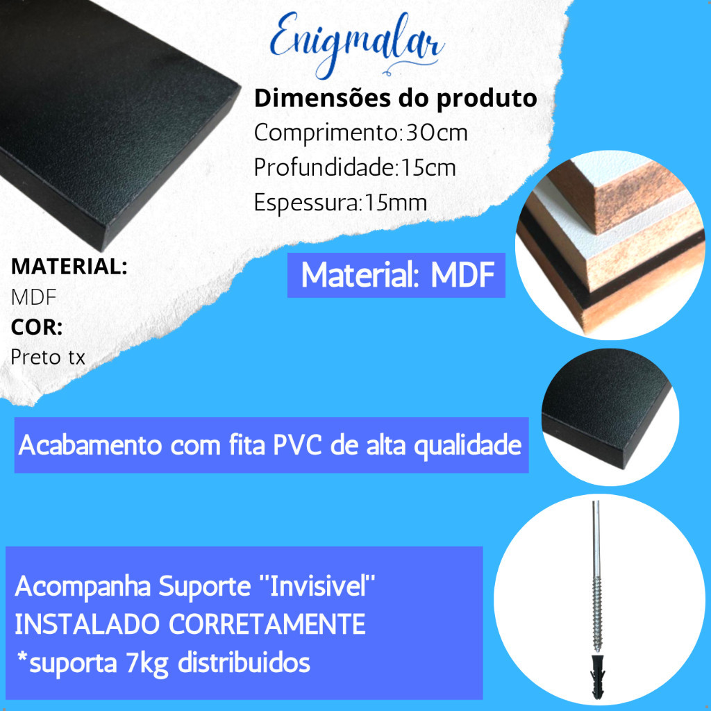 Kit 2 Prateleira Preta 30X15 + Suporte Flutuante Mdf Organizadora Decoração Cozinha Banheiro Sala