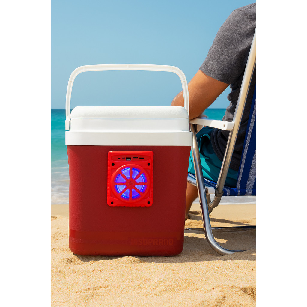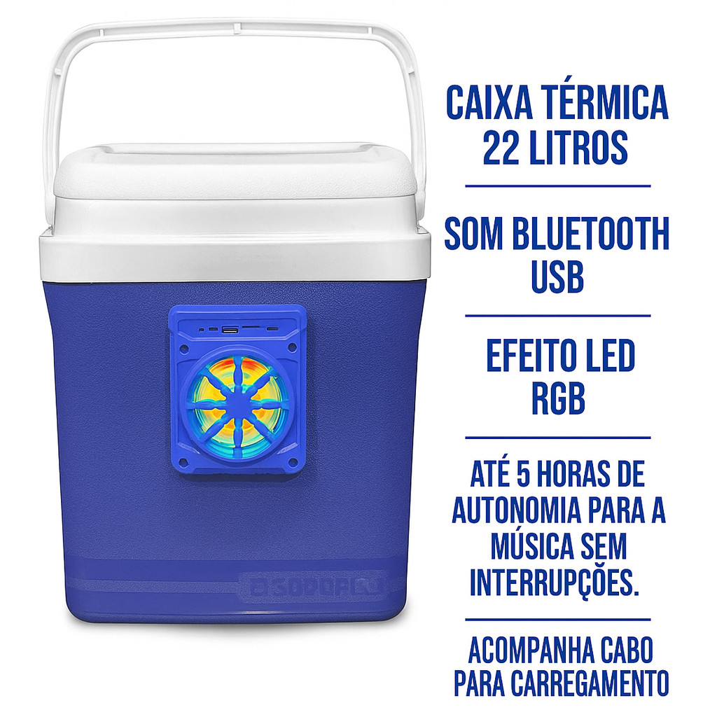 Caixa Termica Cooler Tampa Alça Som Bluetooth Usb Fm Led Rgb Portátil Bateria Carregador