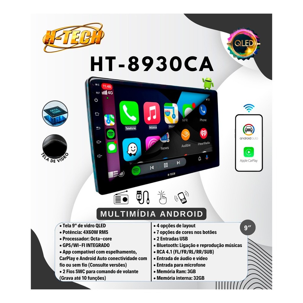 Central Multimidia H-tech HT-8930CA 2 Din Carplay Android Auto Sem fio 9 Polegadas 3 GB 32 GB
