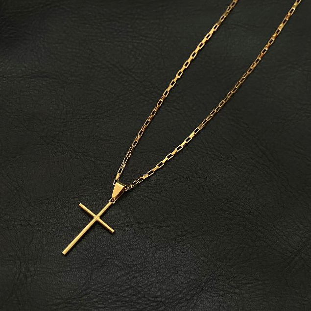 Colar Corrente Masculina Grumet Dourada Pingente Cruz Unissex + Pulseira Tijolinho Aço Inoxidável
