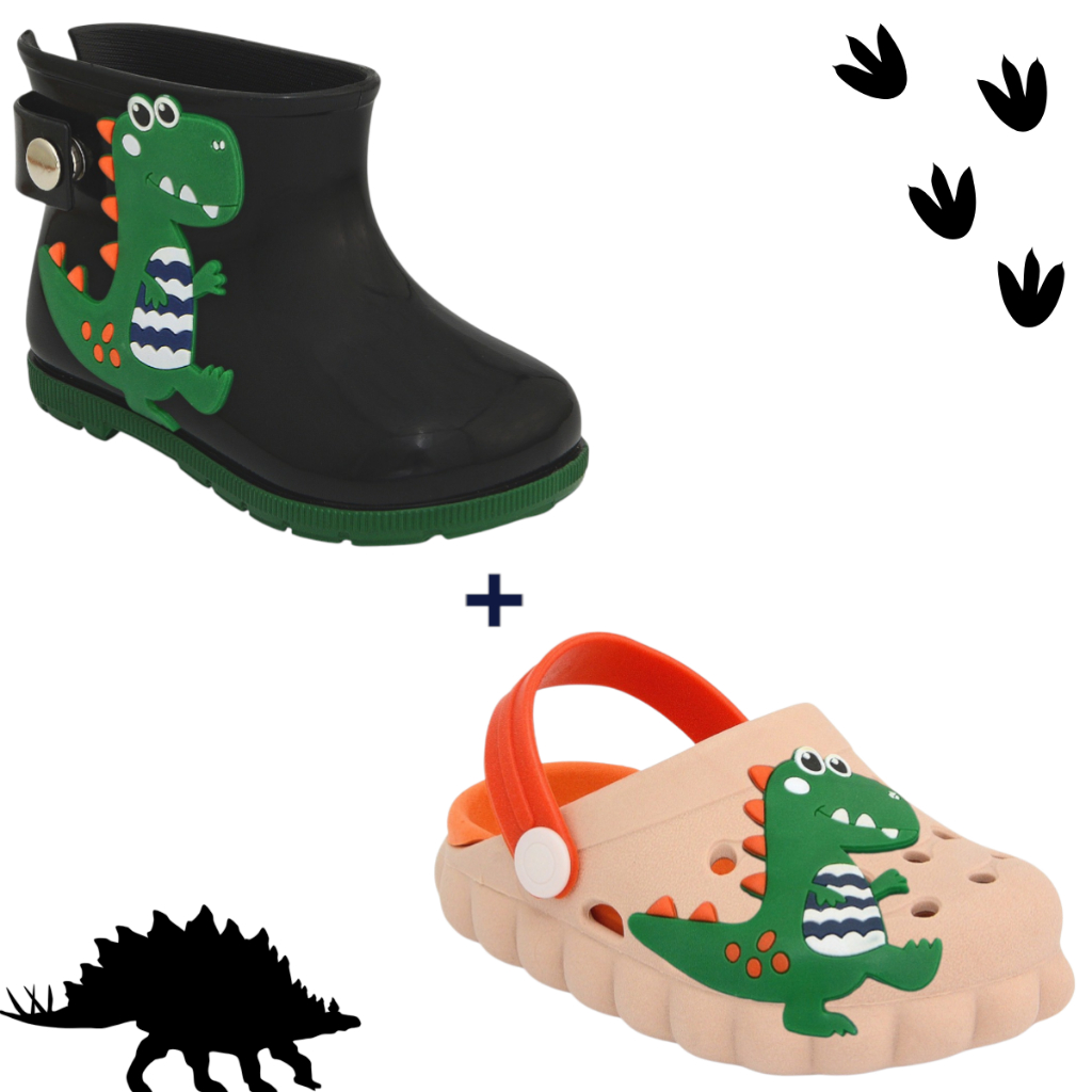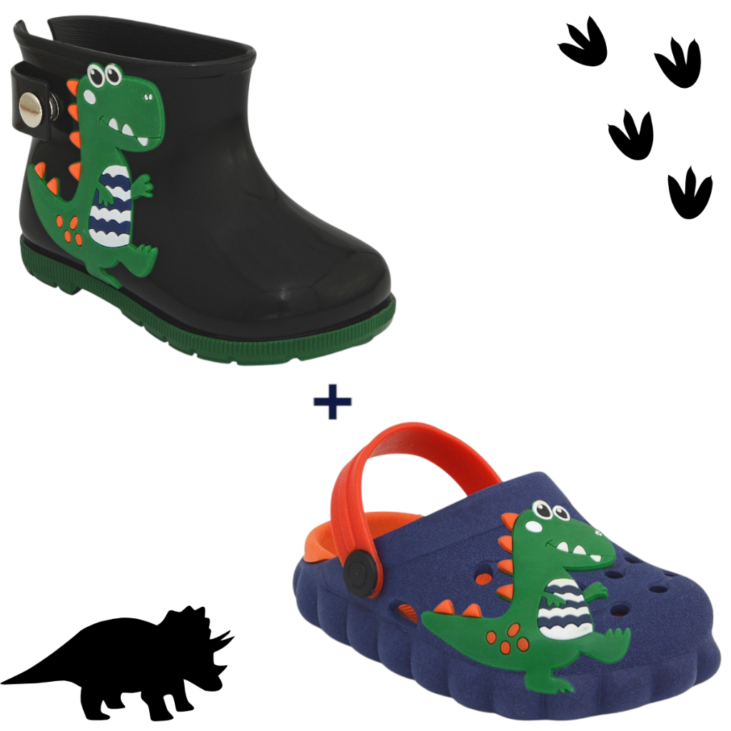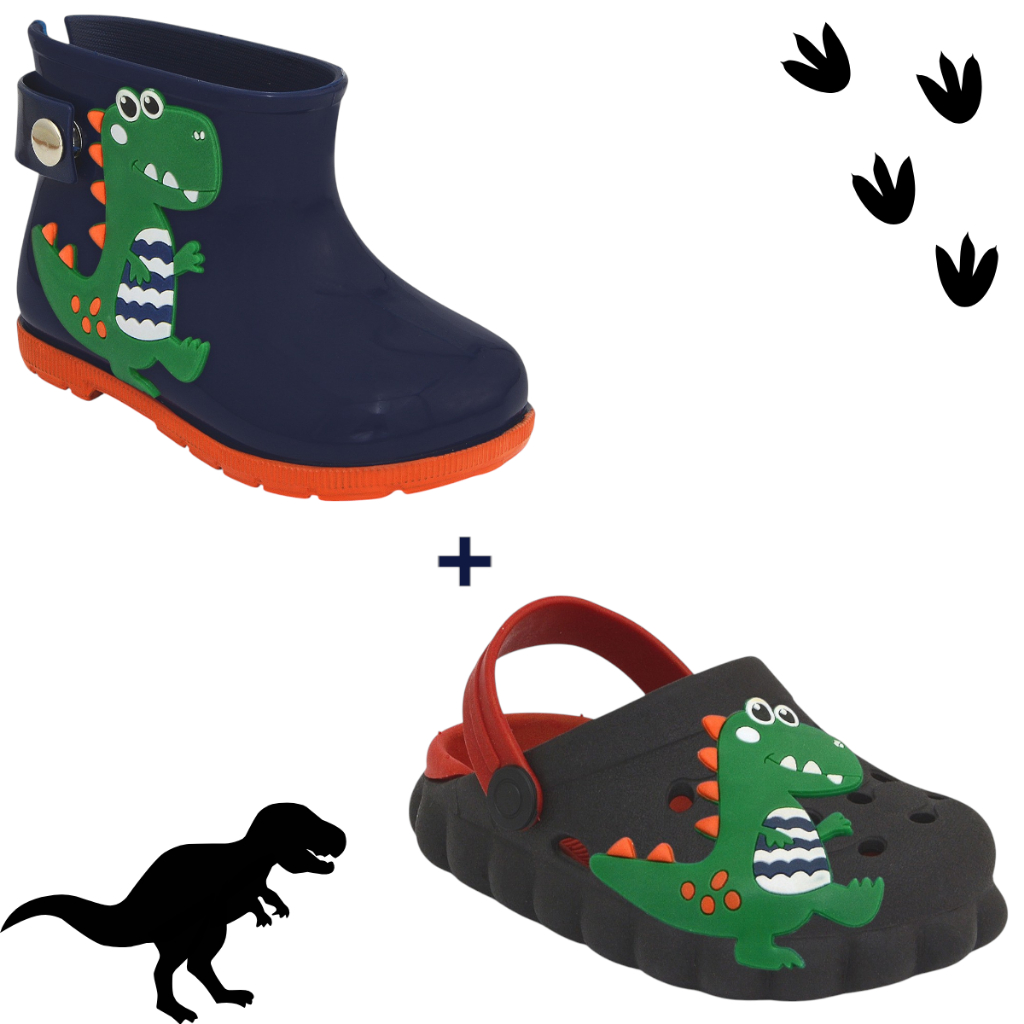 Kit bota galocha e babuche infantil menino masculino dinossauro lançamento