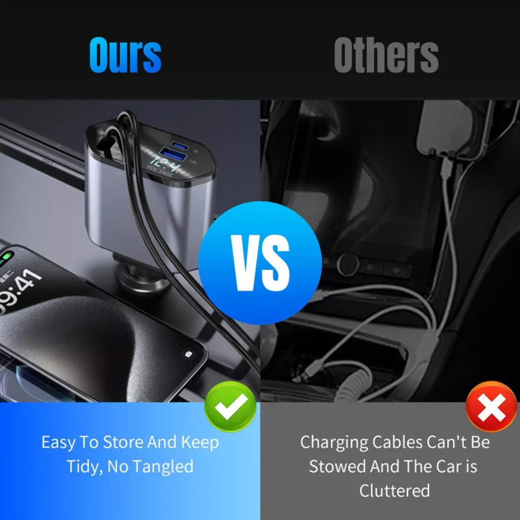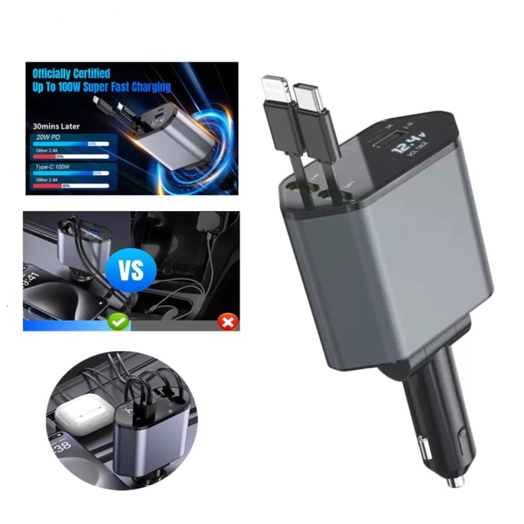 Carregador de carro retrátil, carregador rápido de para carro 4 em 1 para iPhone e Android