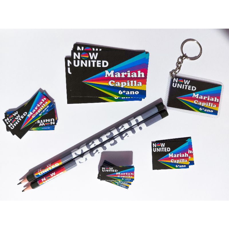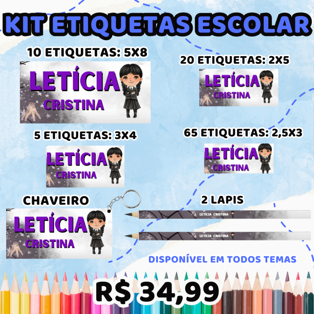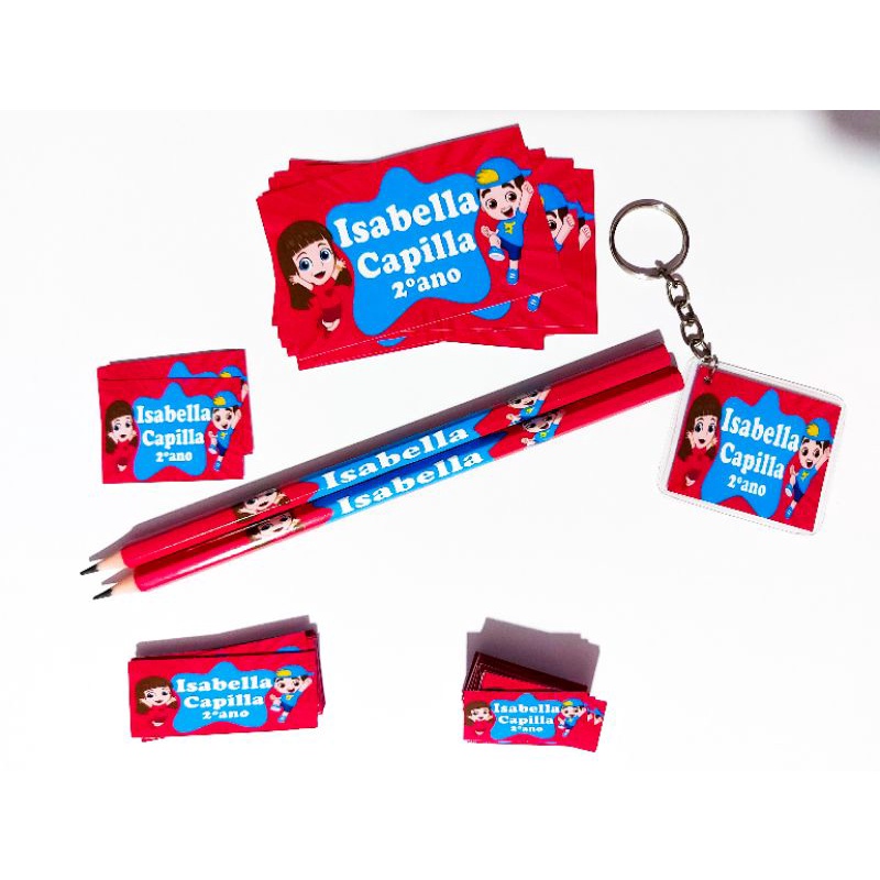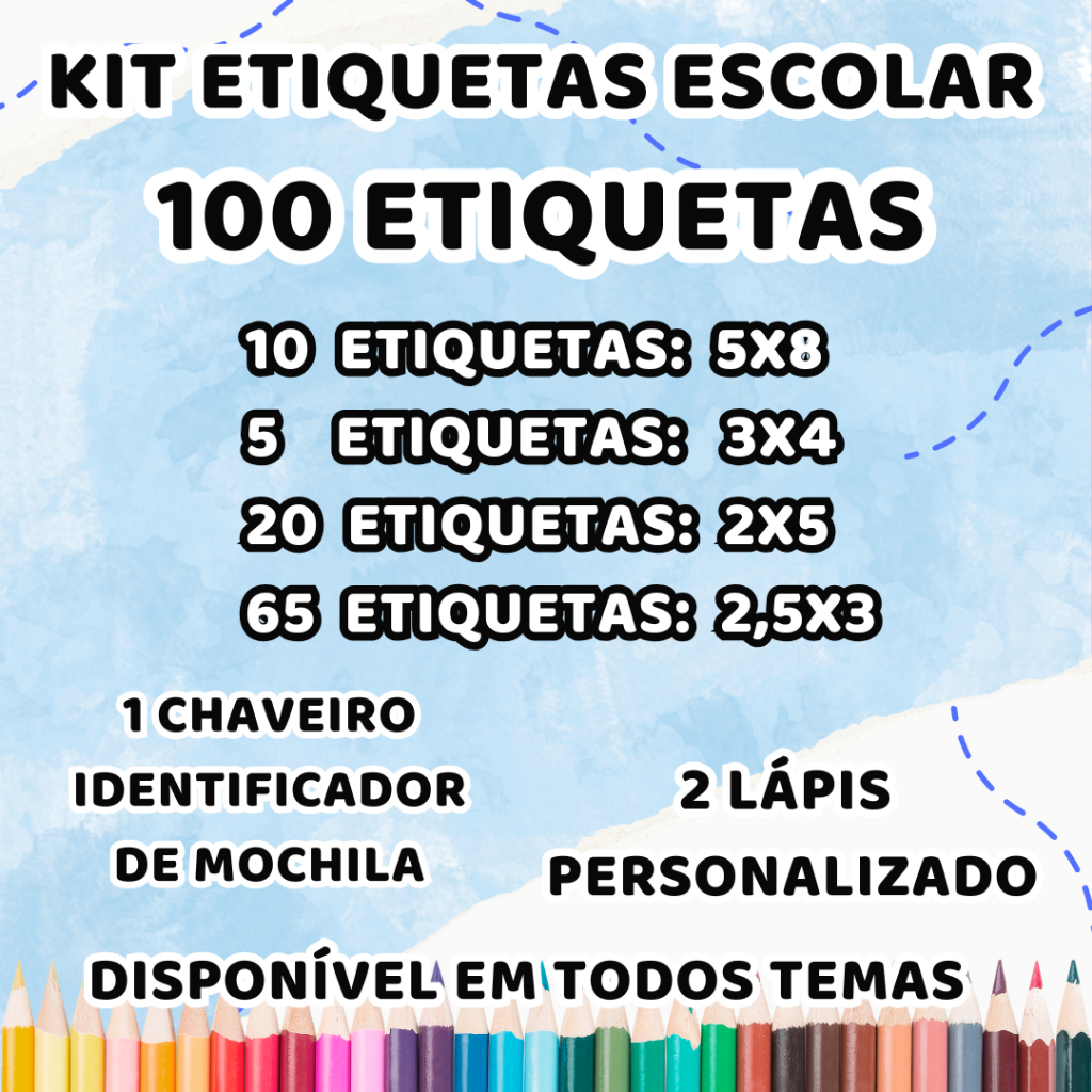 KIT ESCOLAR ETIQUETA PERSONALIZADA 100 etiquetas 1 chaveiro identificador de mochila 2 lapis