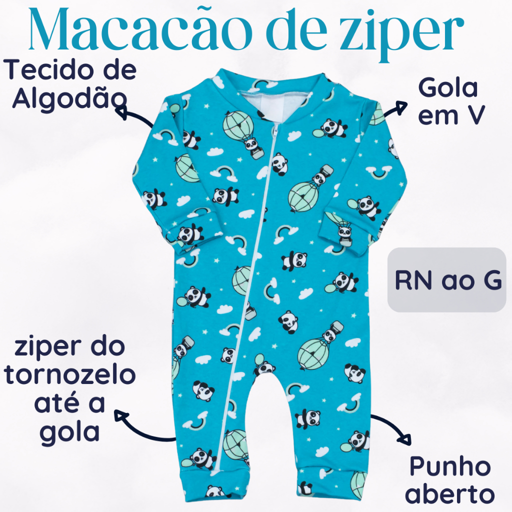 Macacão Para Bebê Menino Com Ziper Estampa Panda Azul 100% Algodão Confortável e Antialérgico