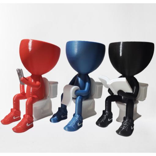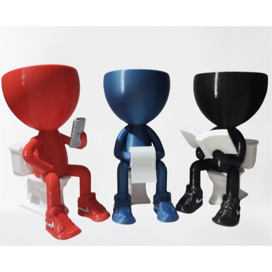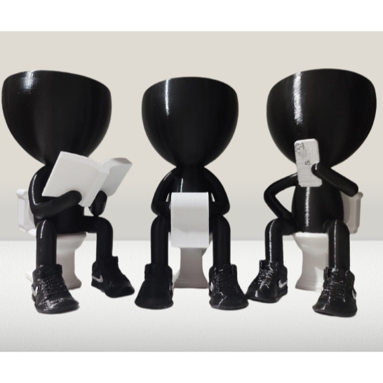 Kit Decorativo 3 Vasinhos na privada com rolo de papel higiênico lendo livro e com celular decoração 3D presente