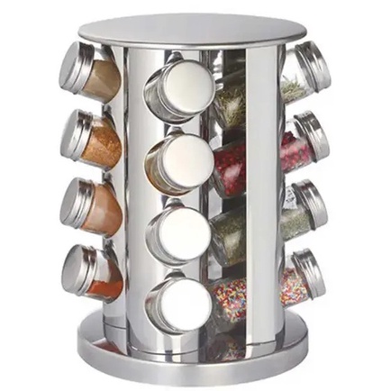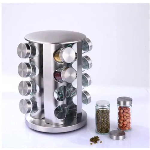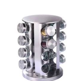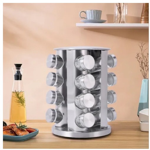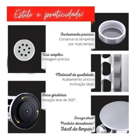 Porta Tempero e Condimento Premium Suporte Giratório Redondo Inox 16 Potes de Vidro + Adesivos + Canetinha