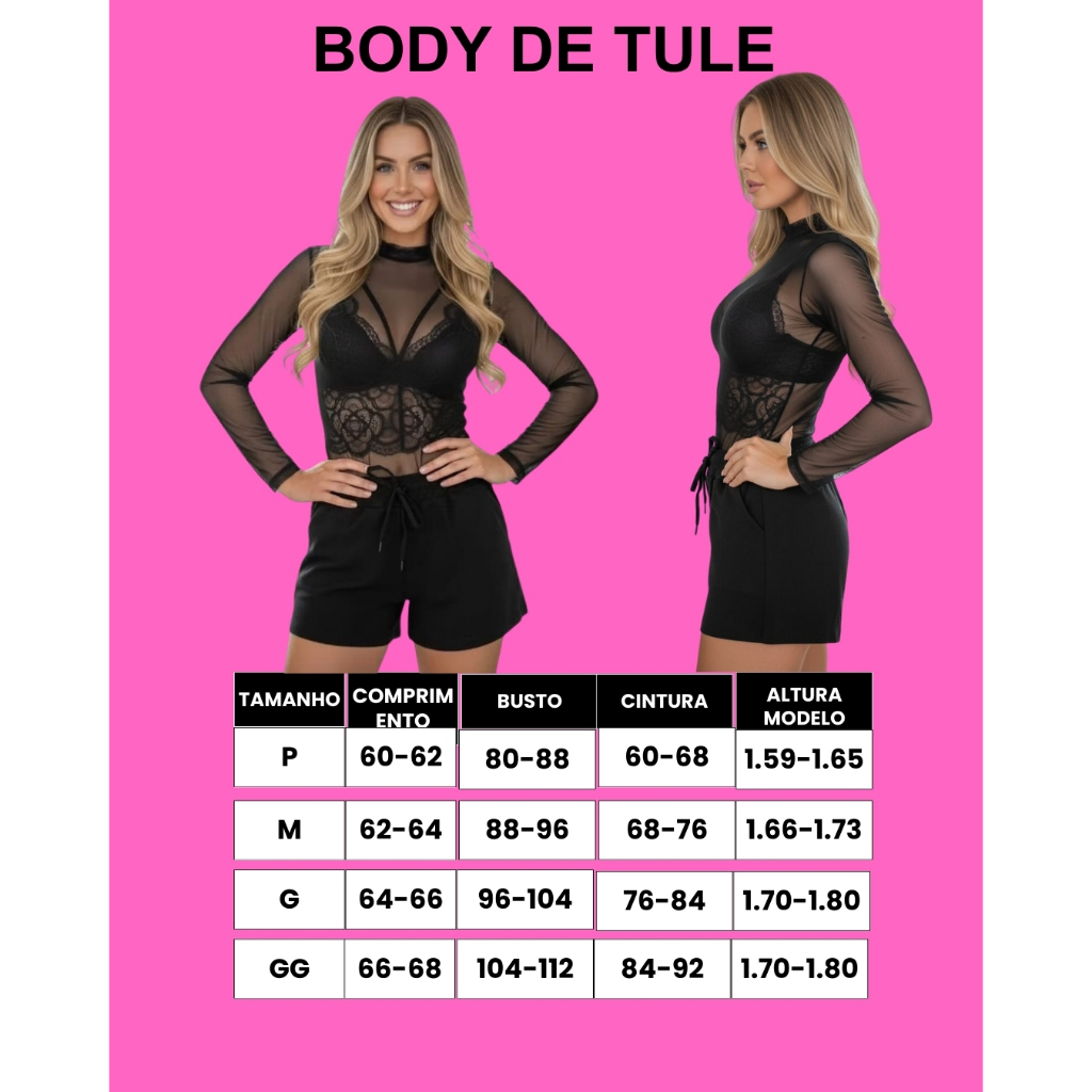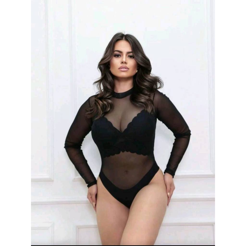Body de Tule Manga Longa Transparente Bori Tendencia Plus Size