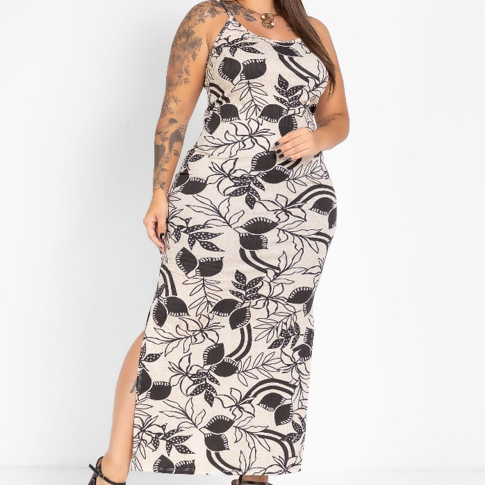 Vestido Alcinha Floral Longo Verão Moderno Canelado Fenda Lateral Florido Gestante Grávida