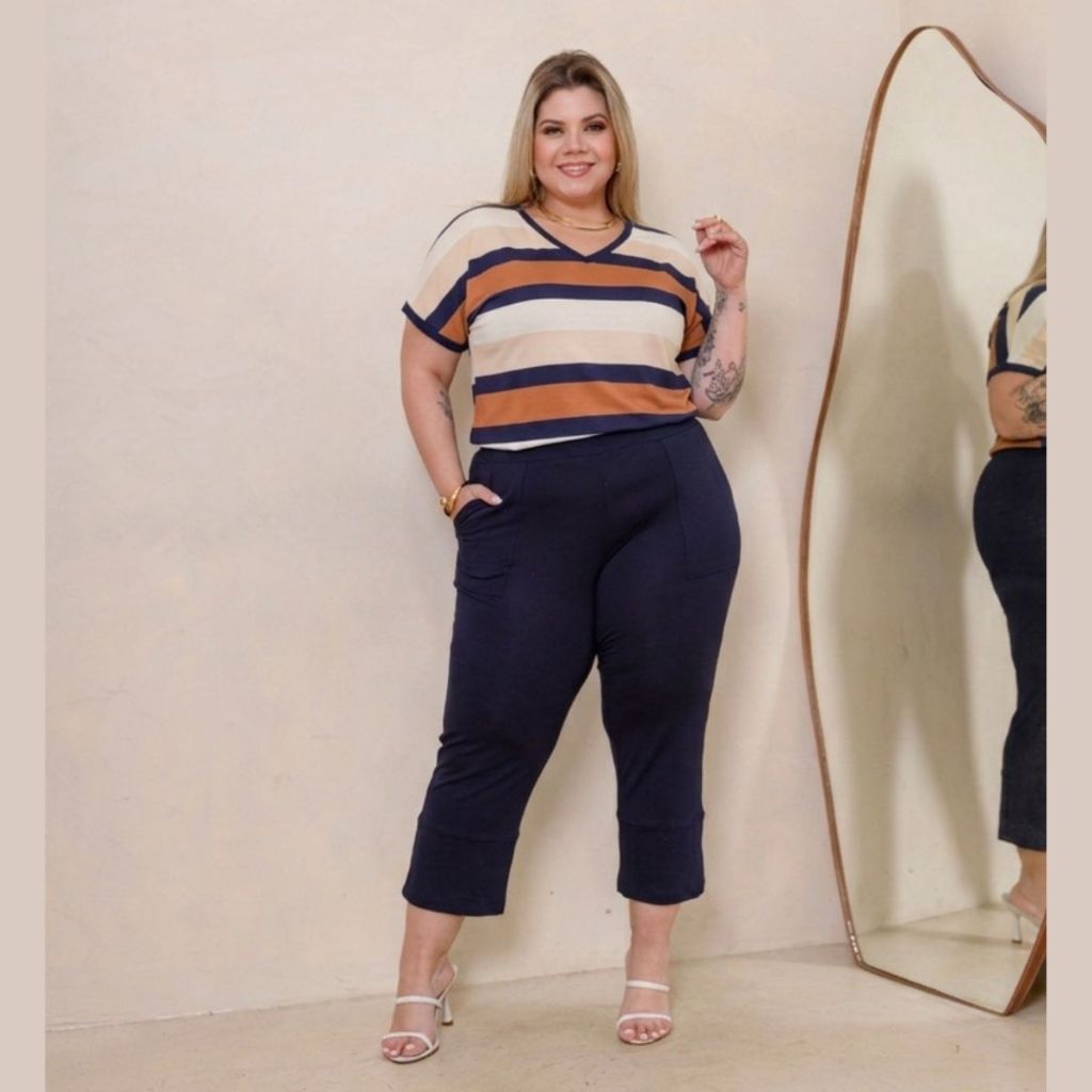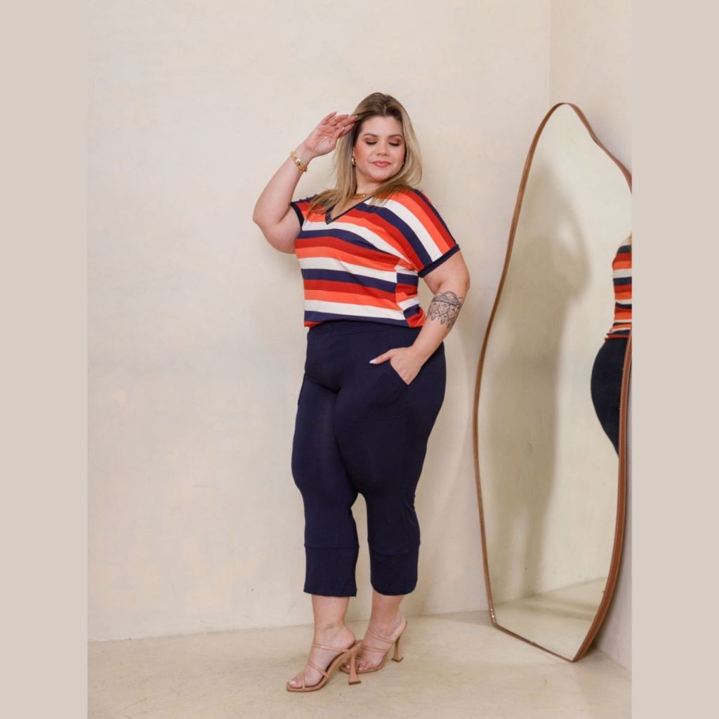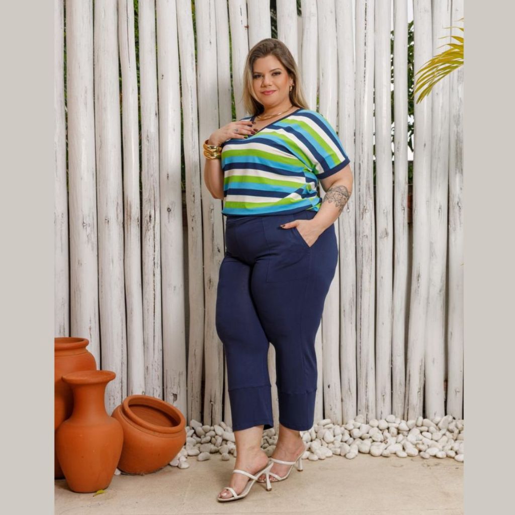 Conjunto Verão Blusa Listrada Manga Curta e Calça Capri Plus Size