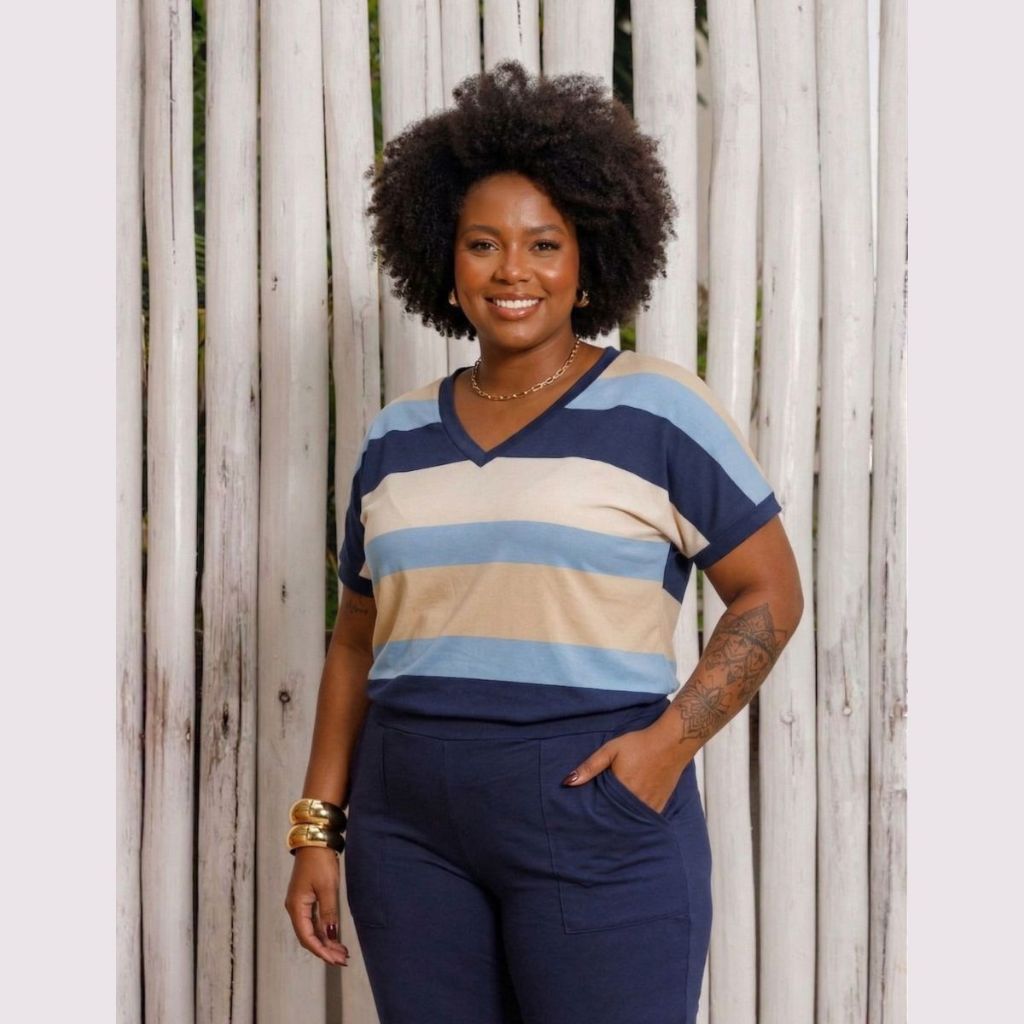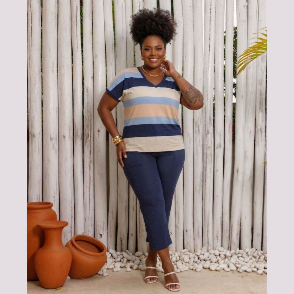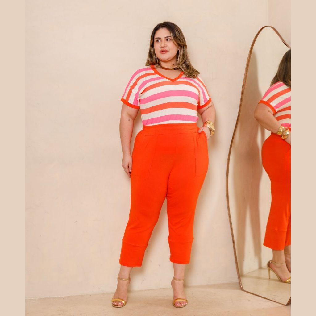 Conjunto Verão Blusa Listrada Manga Curta e Calça Capri Plus Size