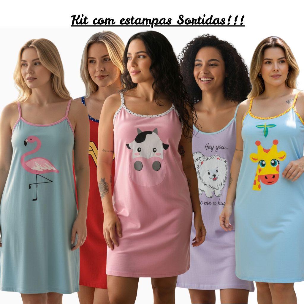 Kit com 3 Camisolas Alcinha ou Meia Manga em Malha estampas sortidas