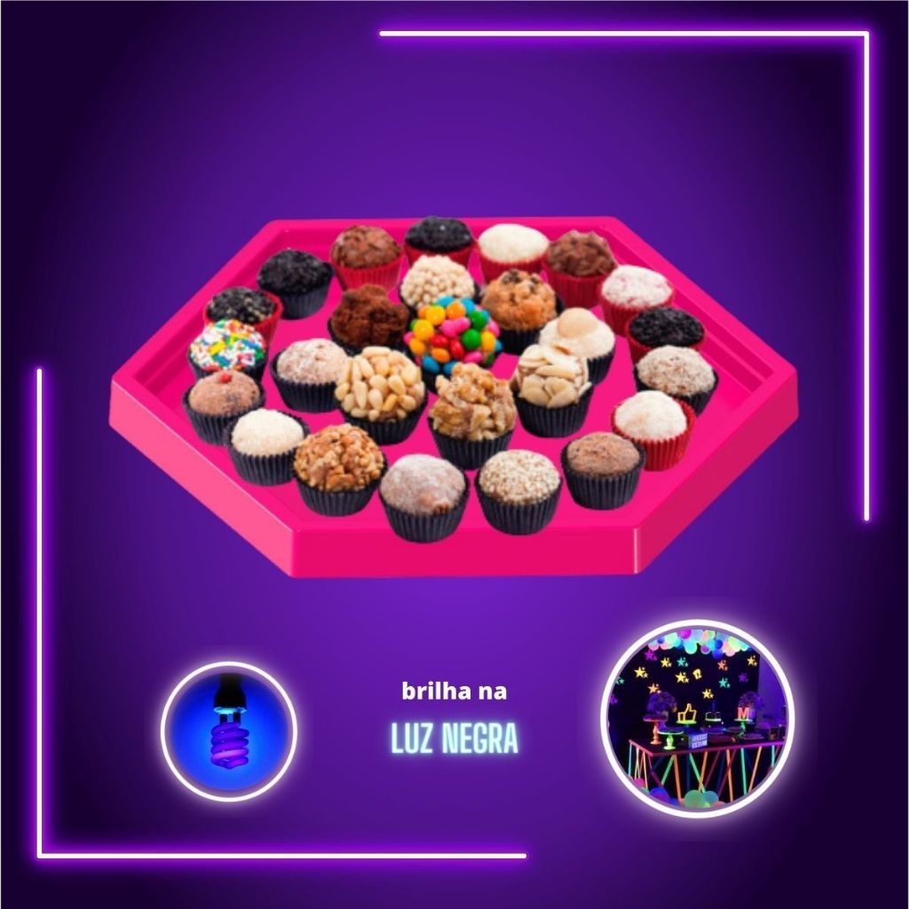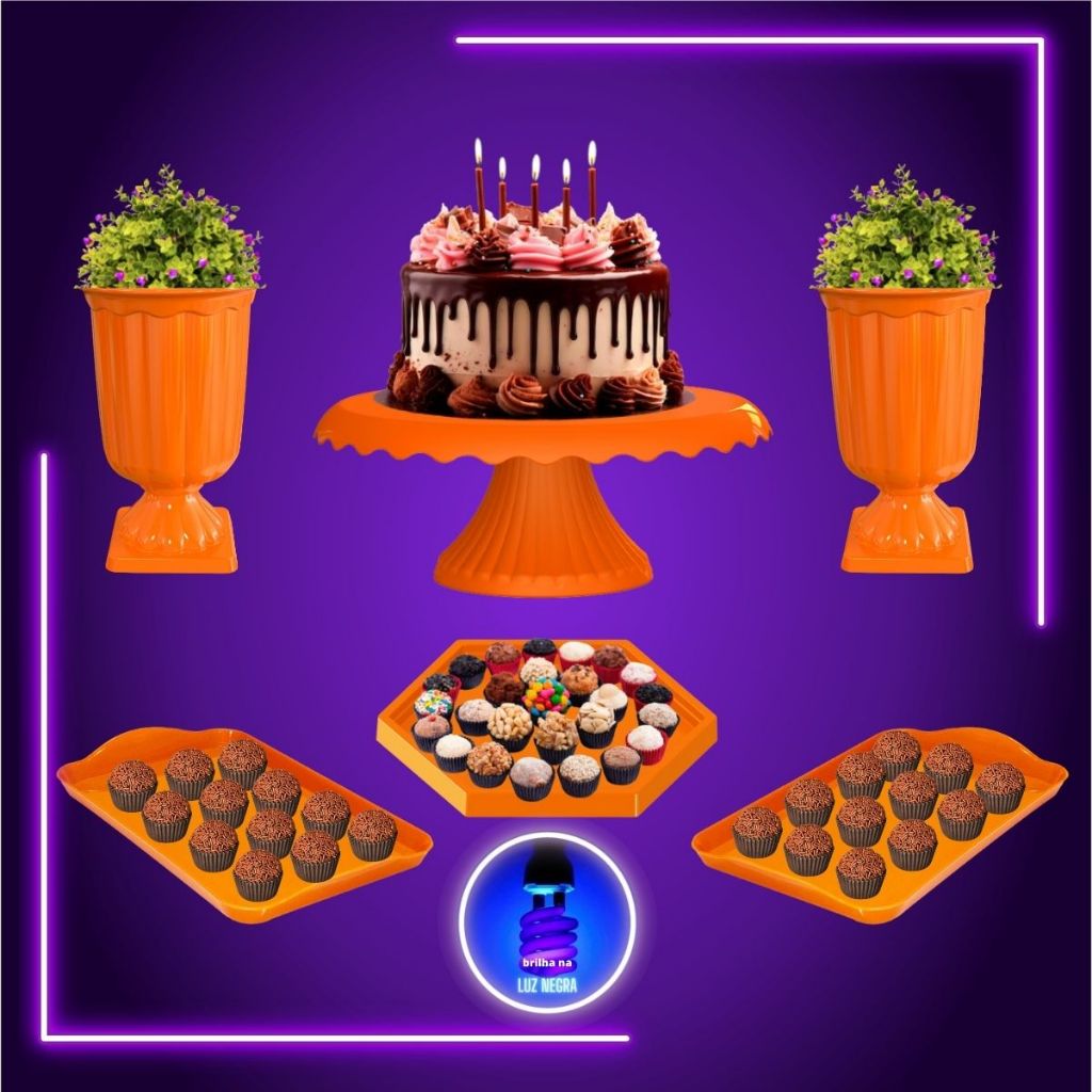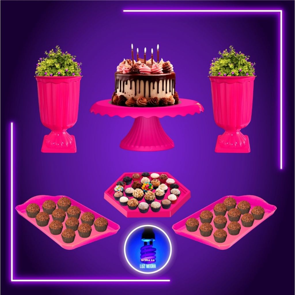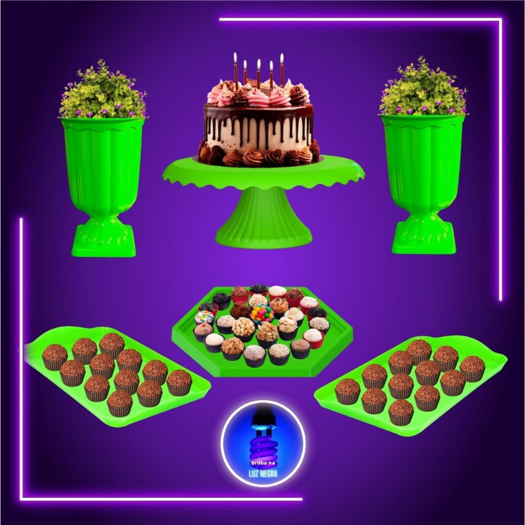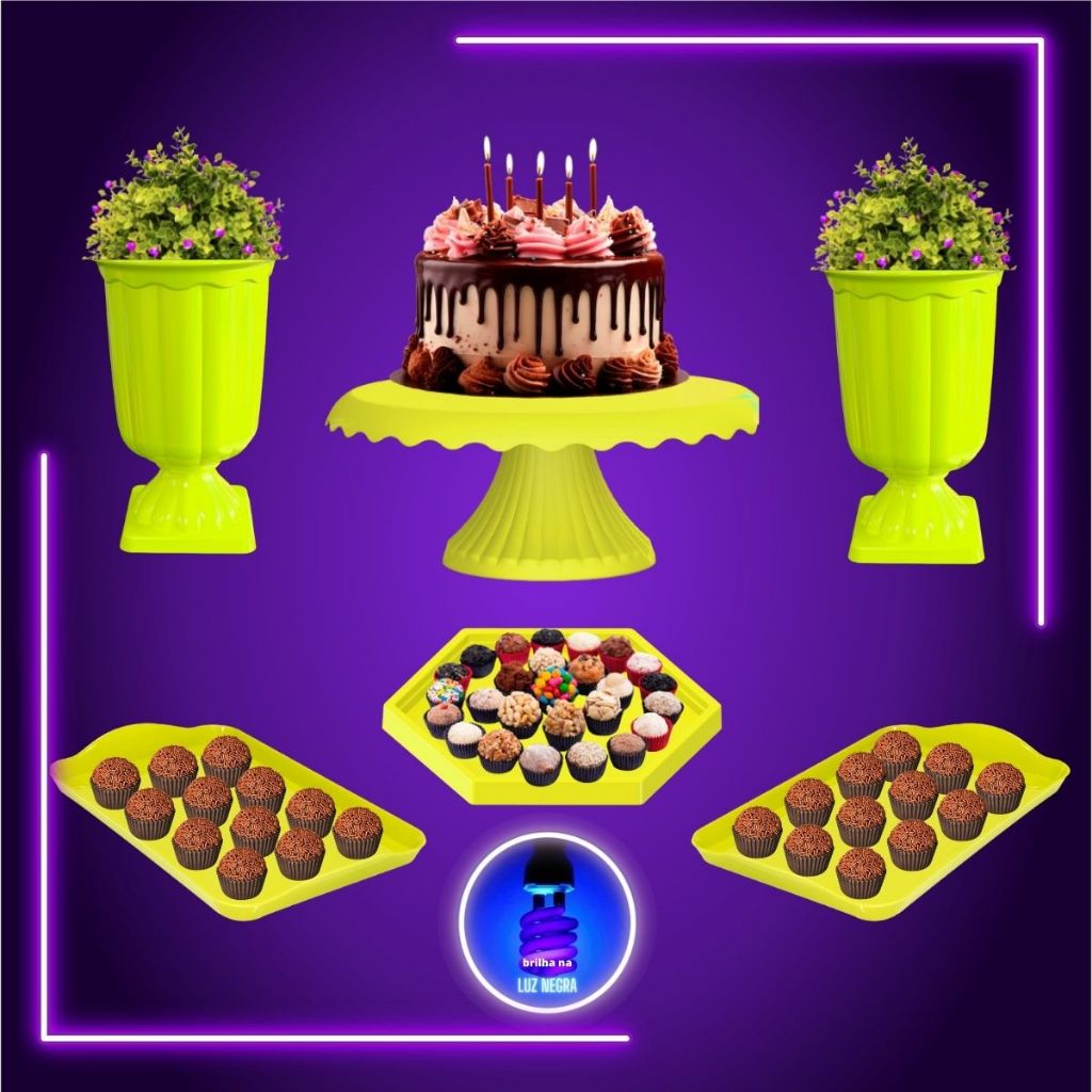 Kit Decoração Mesa Neon Boleira Vaso Grego e Bandejas Brilha na Luz Negra