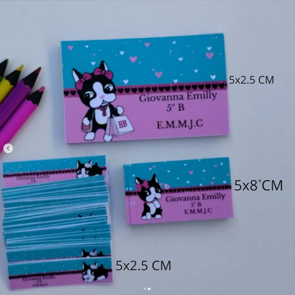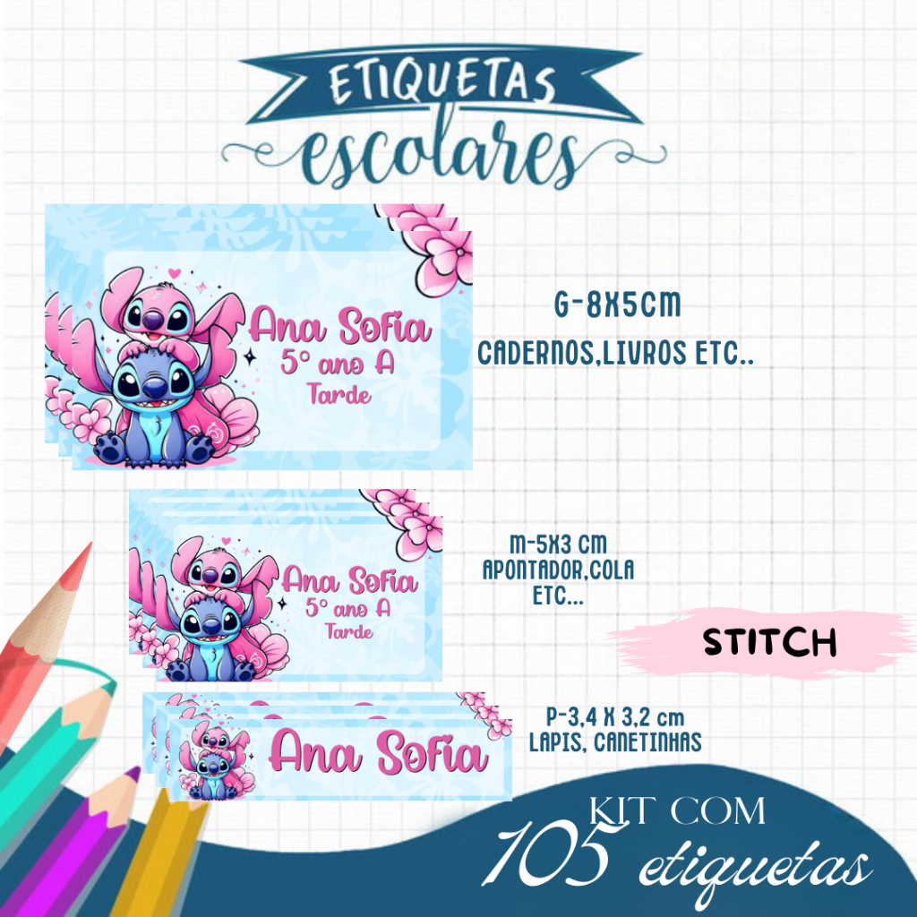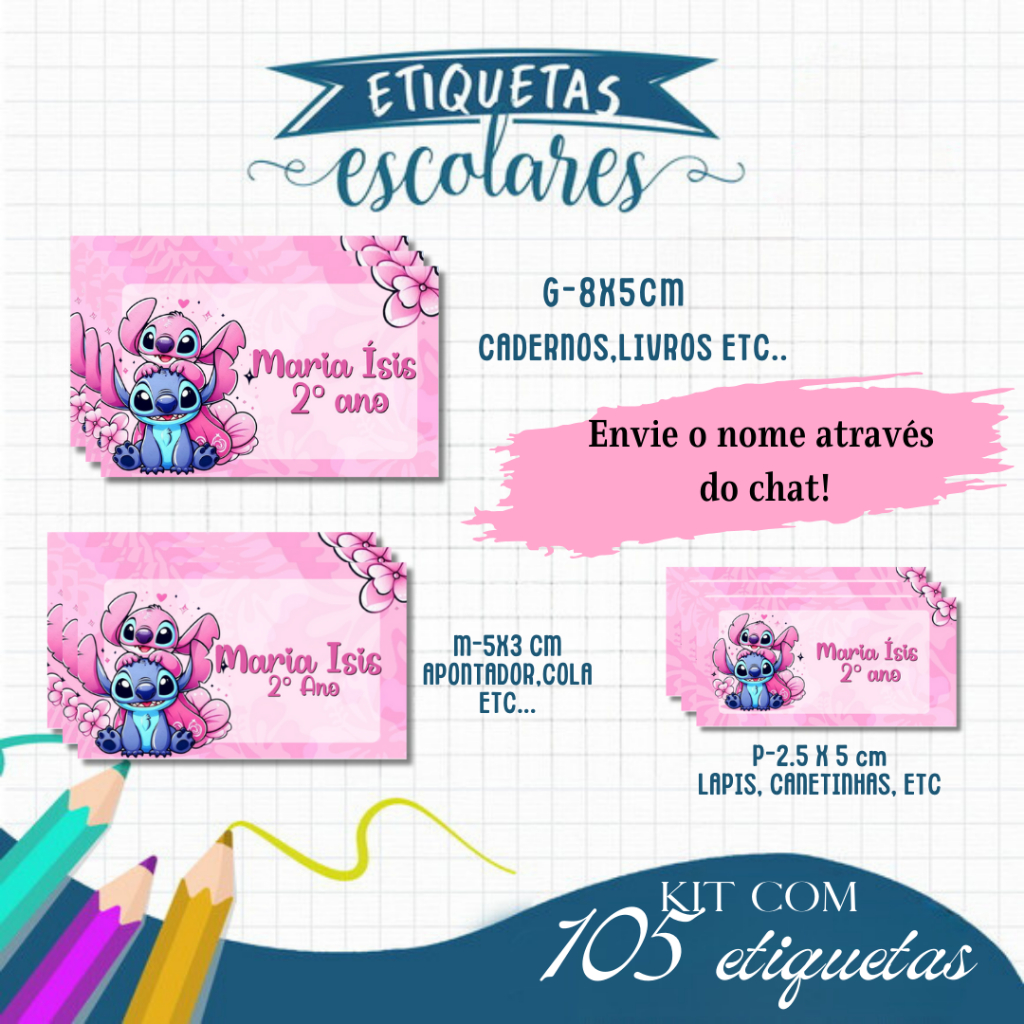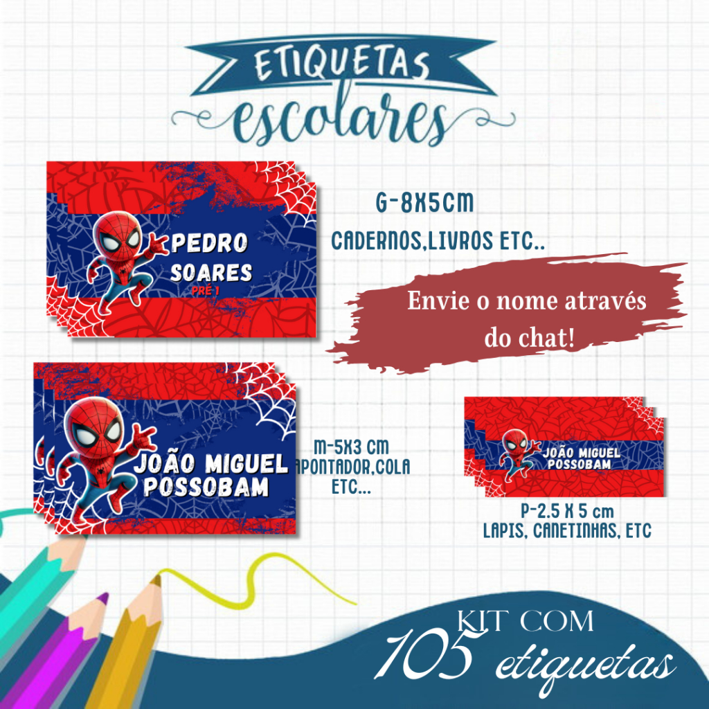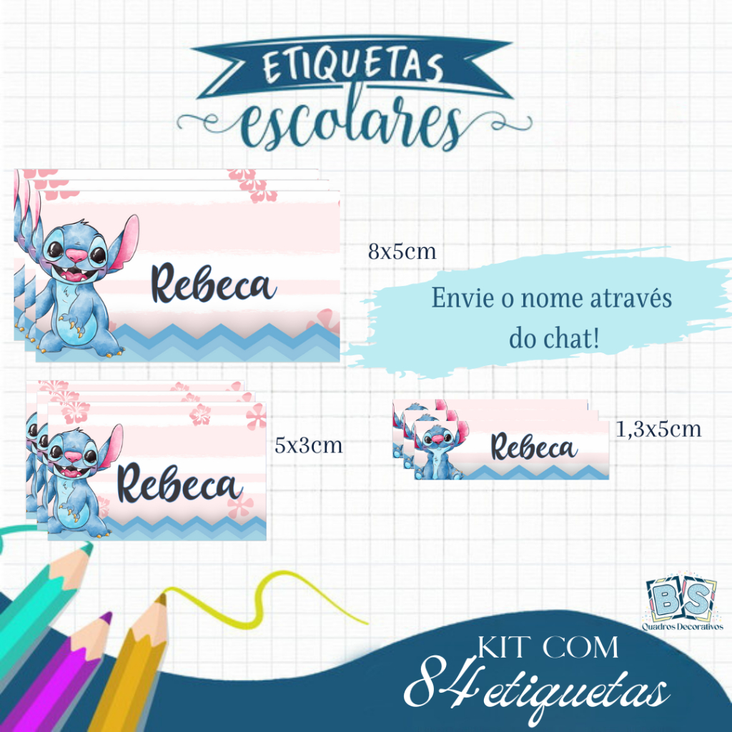Etiqueta Escolar Adesiva Rebeca, Homem Aranha , Dinossauro, Panda, Stitch e Todos os Temas 105 UNIDADES