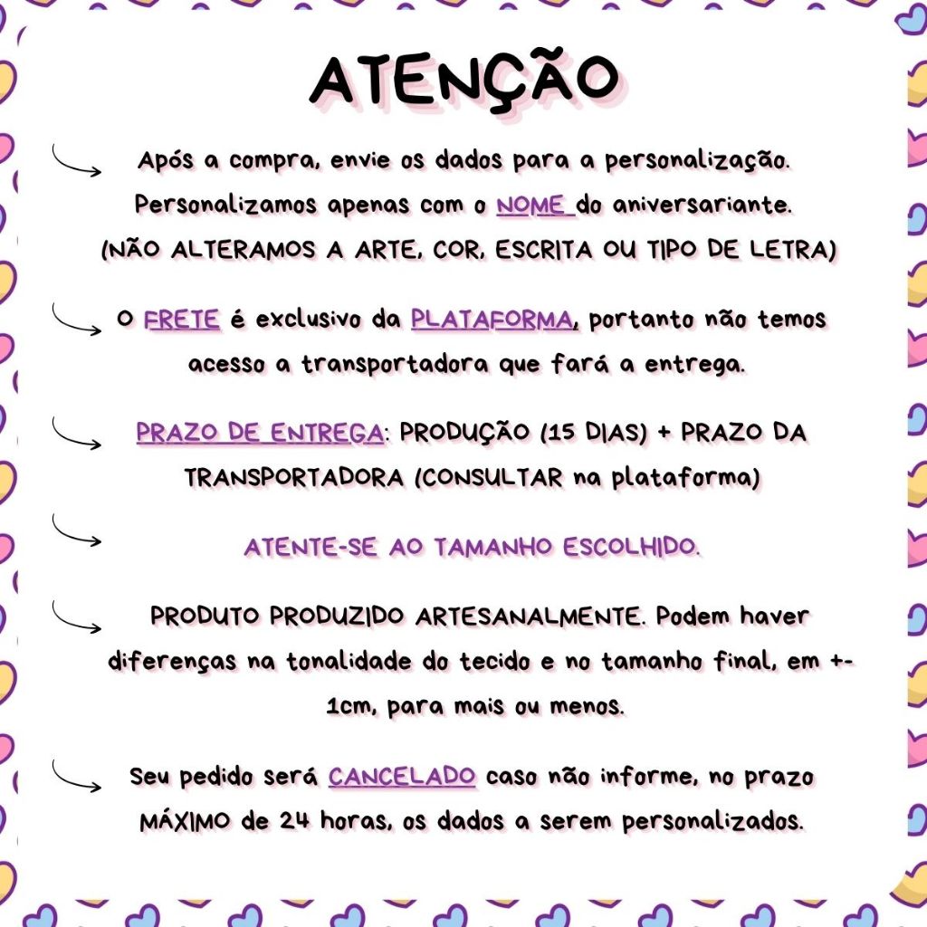 Sob encomenda: envio após 15 dias da compra