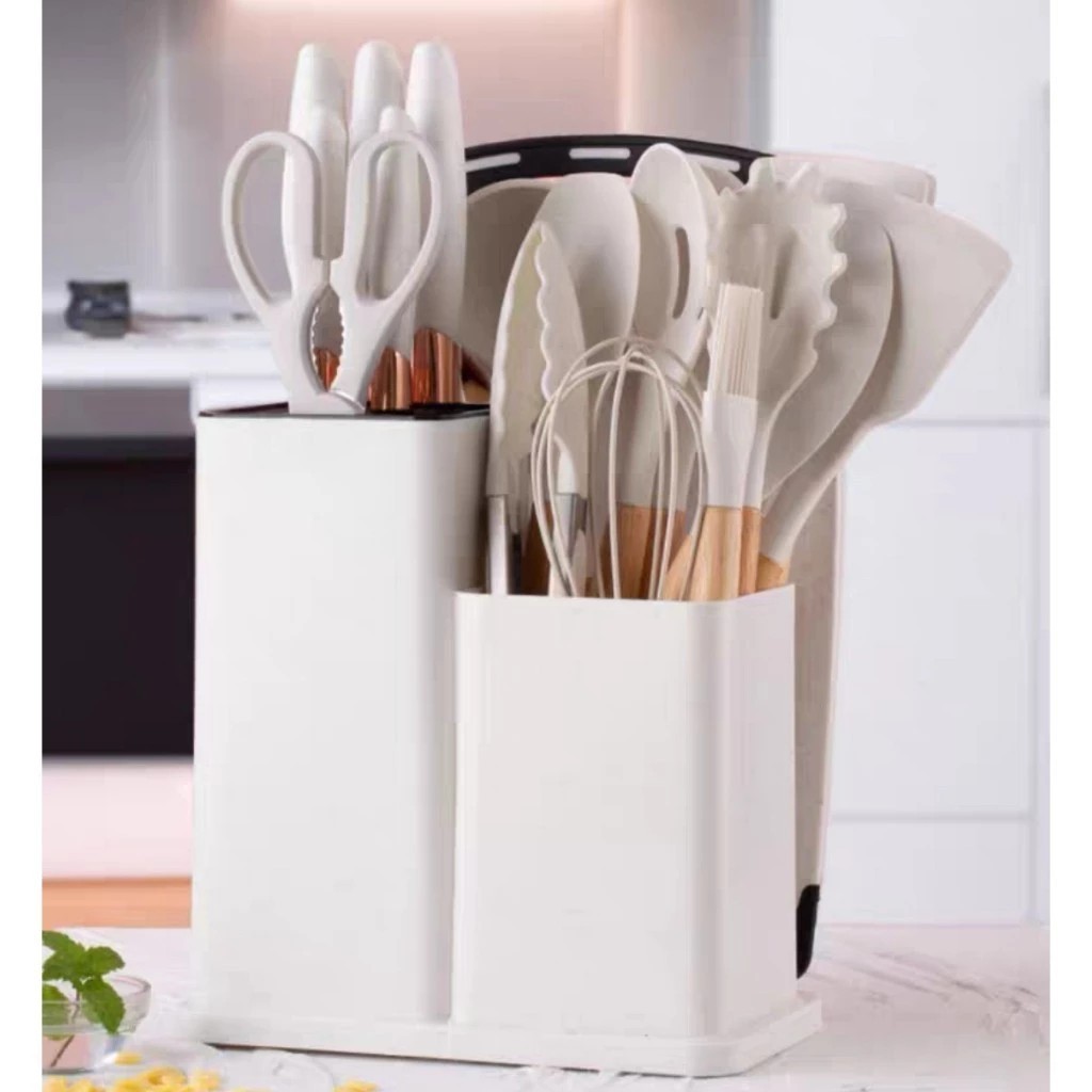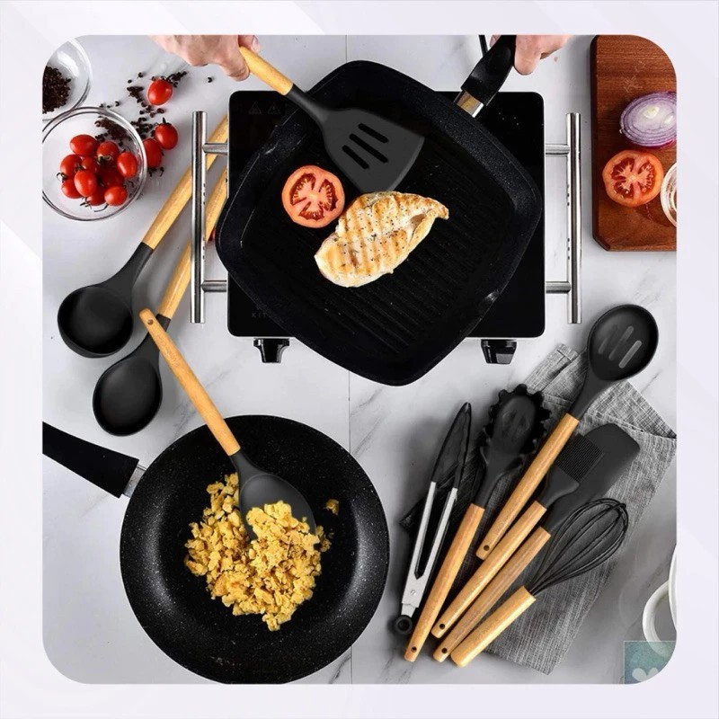 Jogo de Cozinha Kit C/12 Pçs de Silicone Utensílios e Copo Suporte para Cozinha Cabo de Madeira