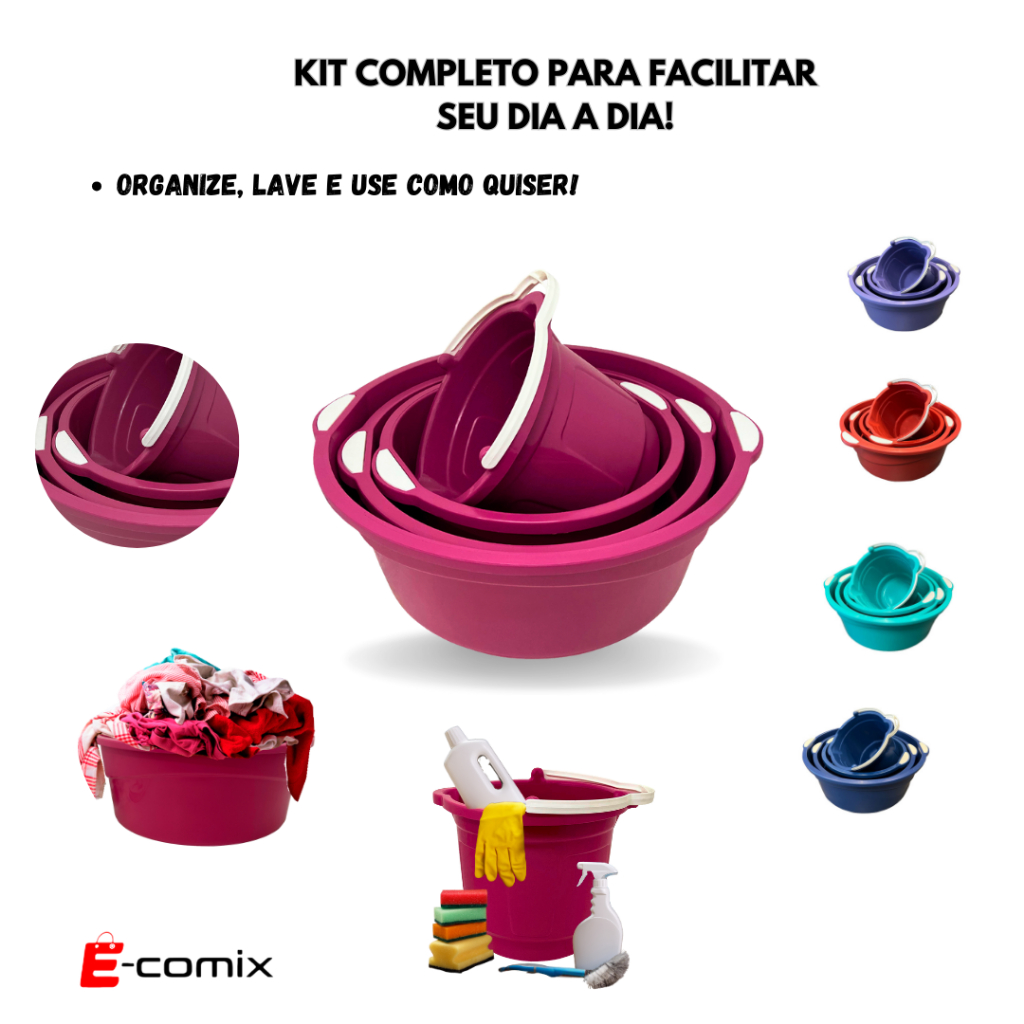 Kit 3 Bacias + Balde Plástico Multiuso Resistente Para Cozinha Lavanderias Limpezas Domésticas Casas