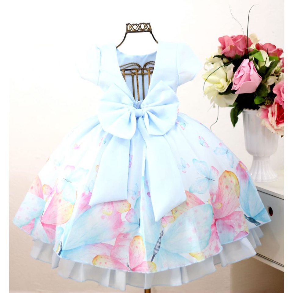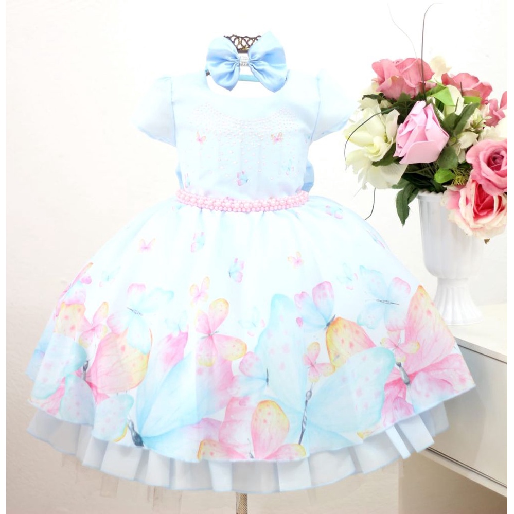 Vestido Infantil Borboleta Azul Jardim Encantado Delicado + Tiara Brinde