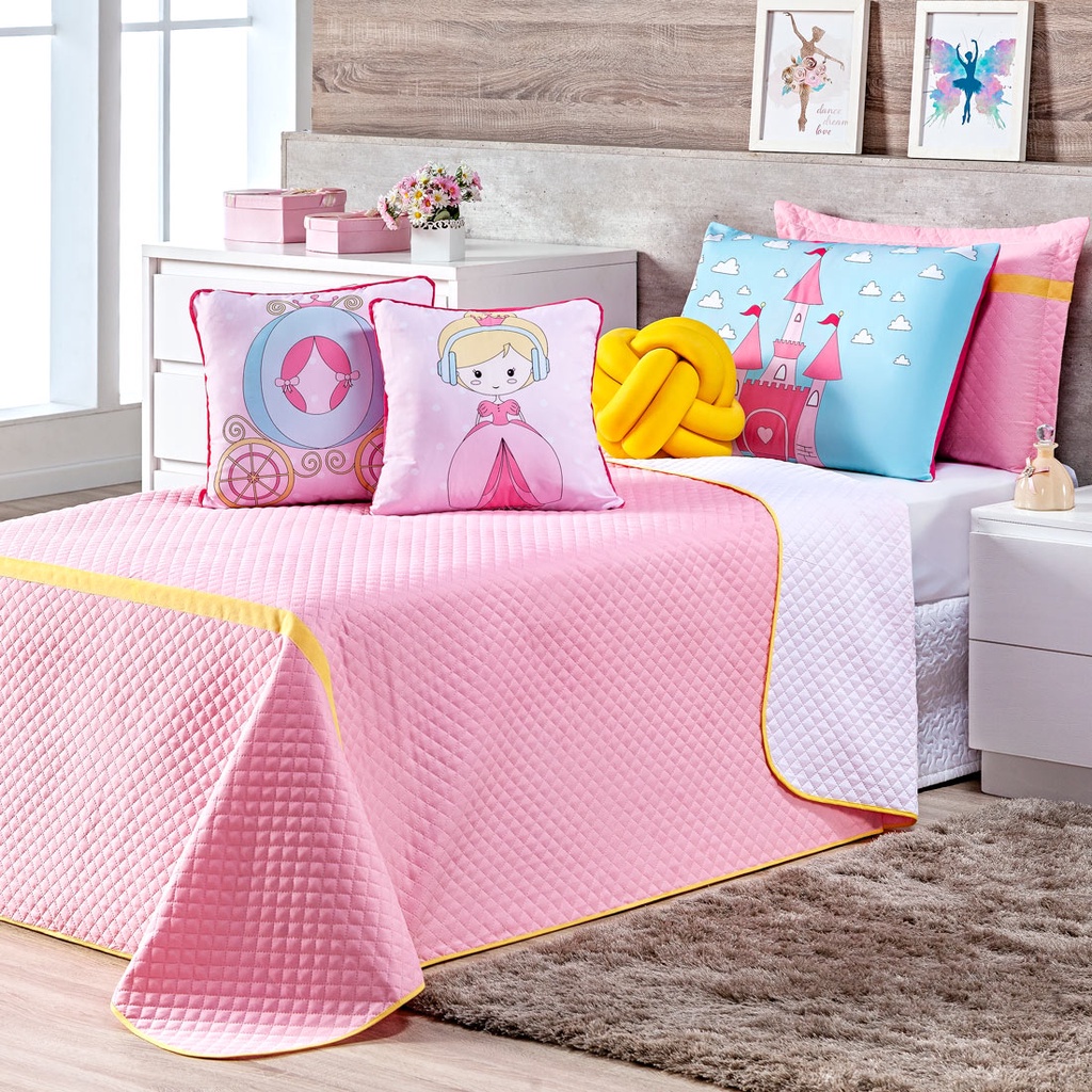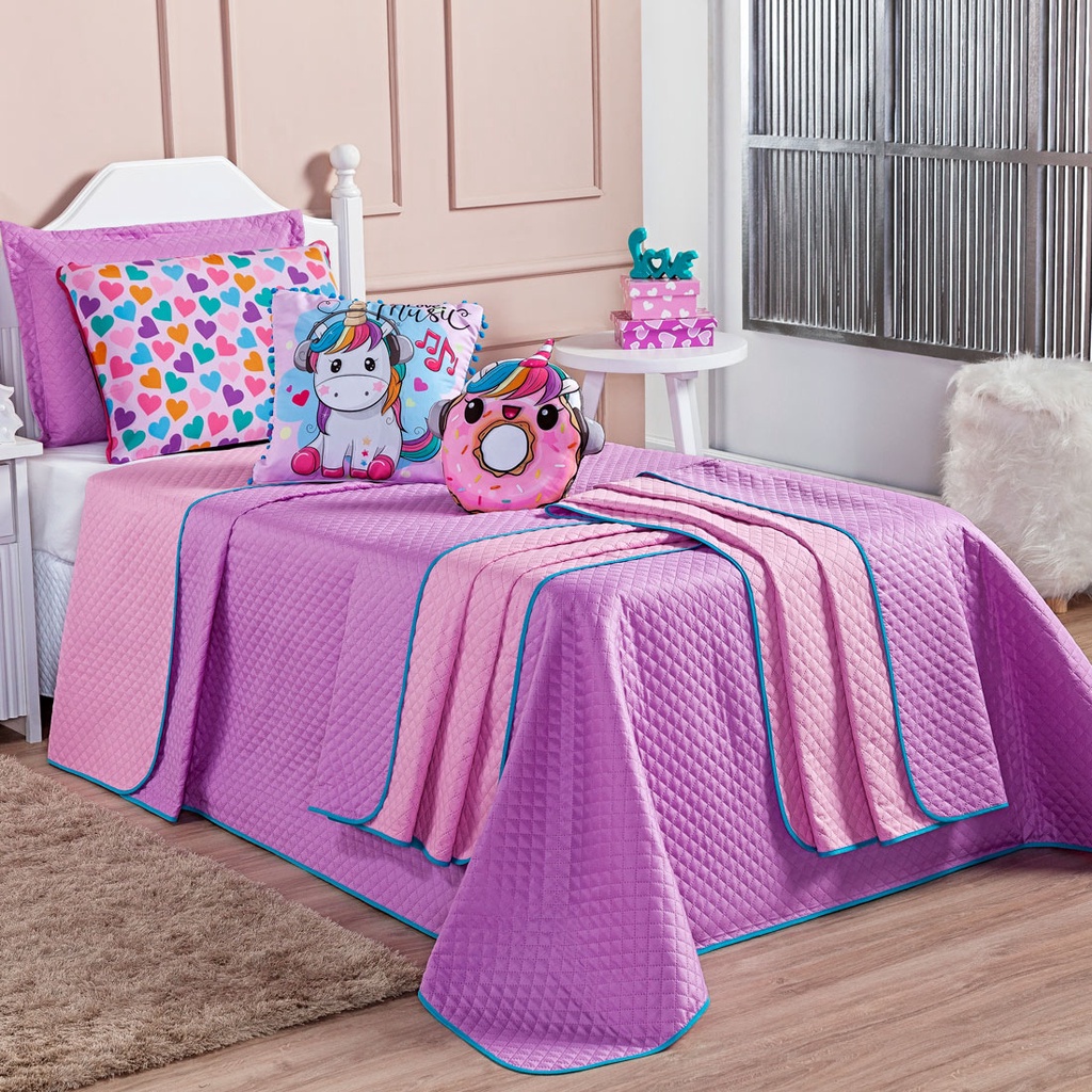 Kit Jogo de Cama SOLTEIRO Completo Colcha Cobre Leito Infantil Menina com Fronhas e Almofadas