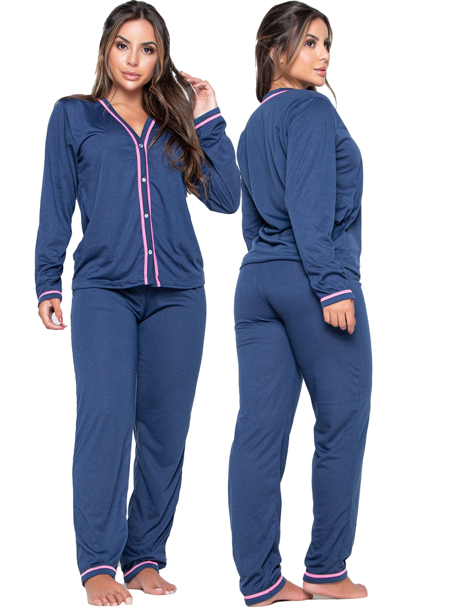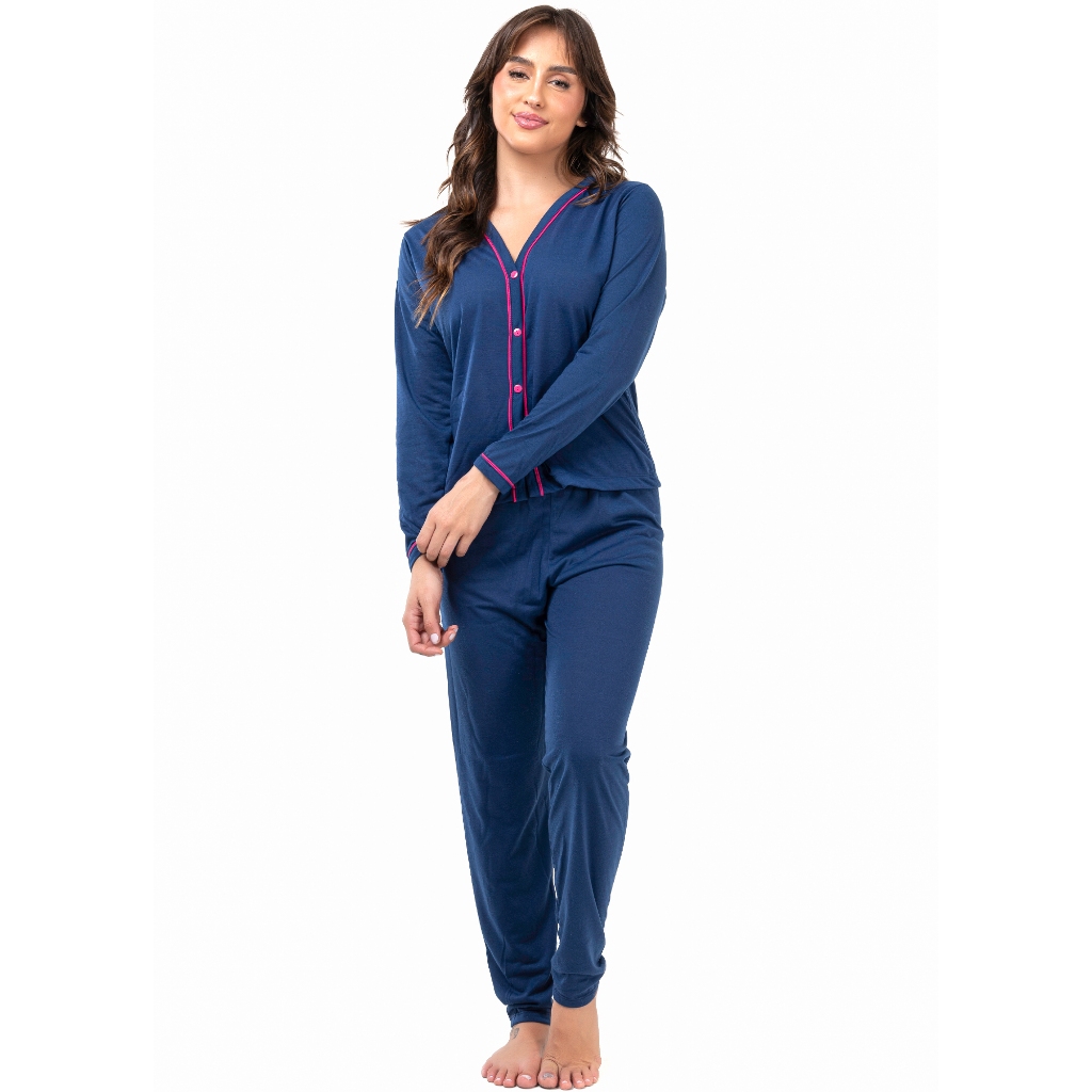 Pijama Longo Feminino Americano com Abertura e Detalhe Camisaria Amamentação Inverno 046