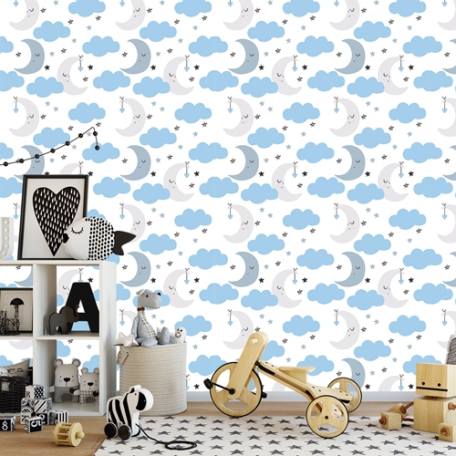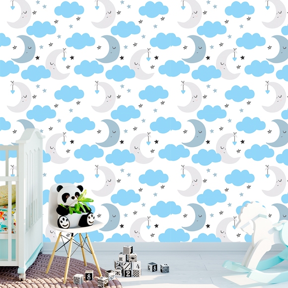 Papel De Parede Adesivo Infantil Nuvens Lua Chuva de Amor Decoração Quarto Infantil Baby Menino Azul
