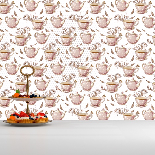 Papel de Parede Adesivo Hora do Chá Rosa bebe Poa Fundo Branco Decoração Cozinha Delicada Marrom