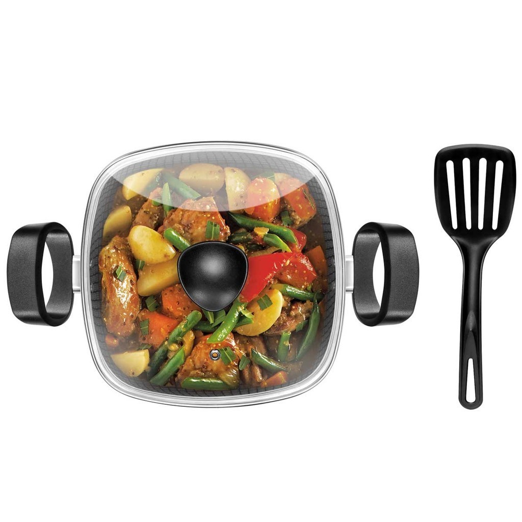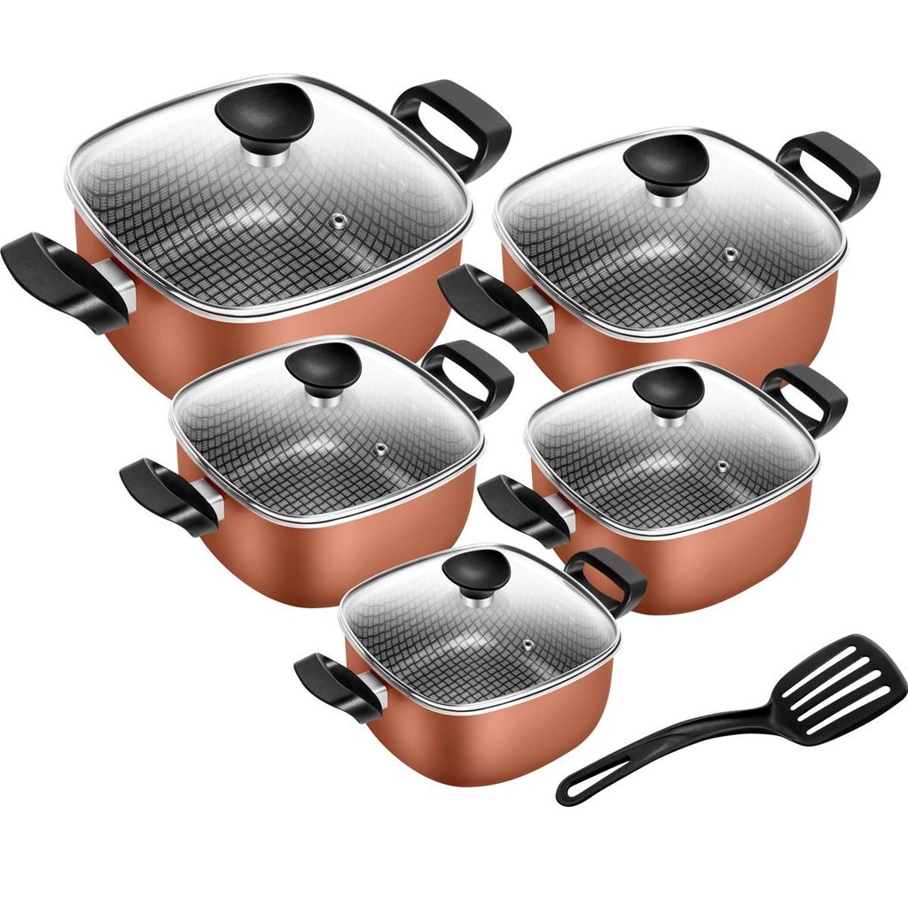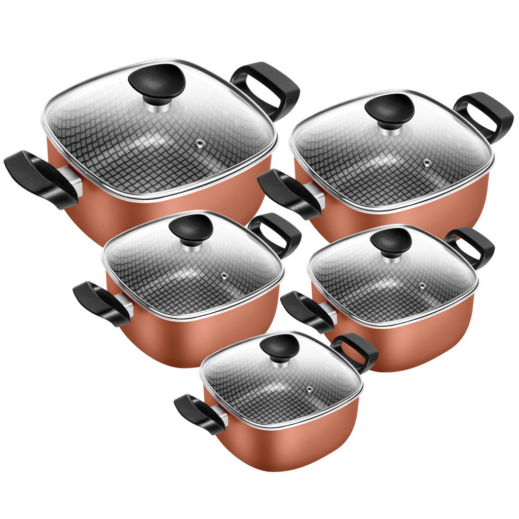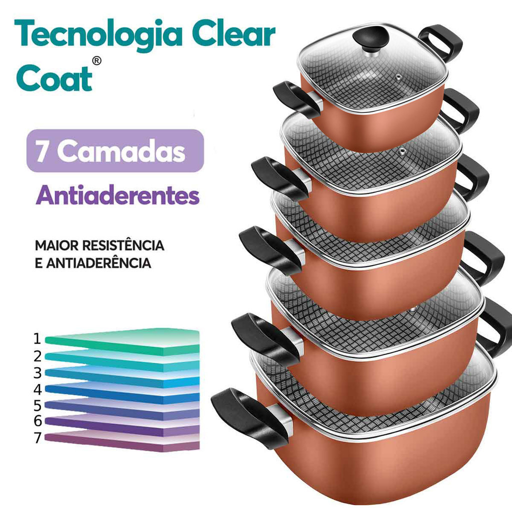 Jogo De Panelas Antiaderente Caçarola Quadrada Premium Cobre 5 Peças Tampa De Vidro Patolux