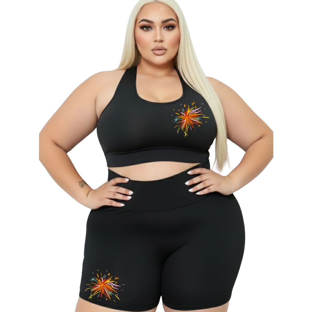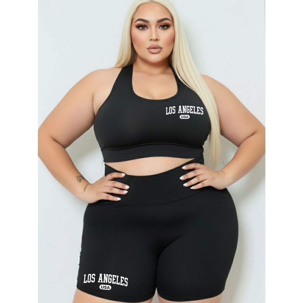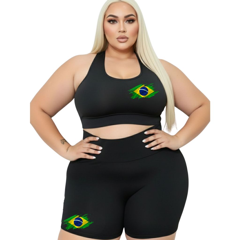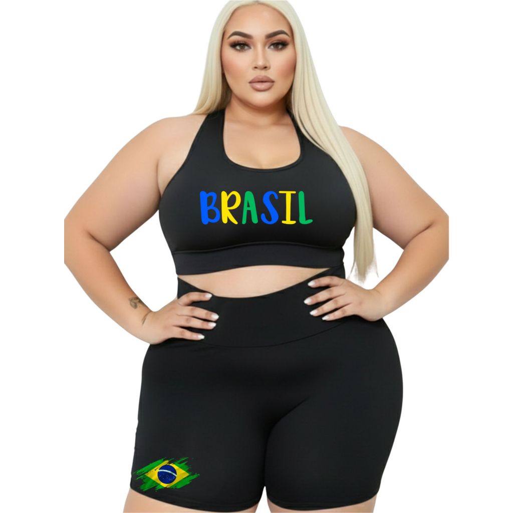 Conjunto Short Meia Coxa + Top Plus Size Estampa Linda Suplex Academia Poliéster GG ao G4