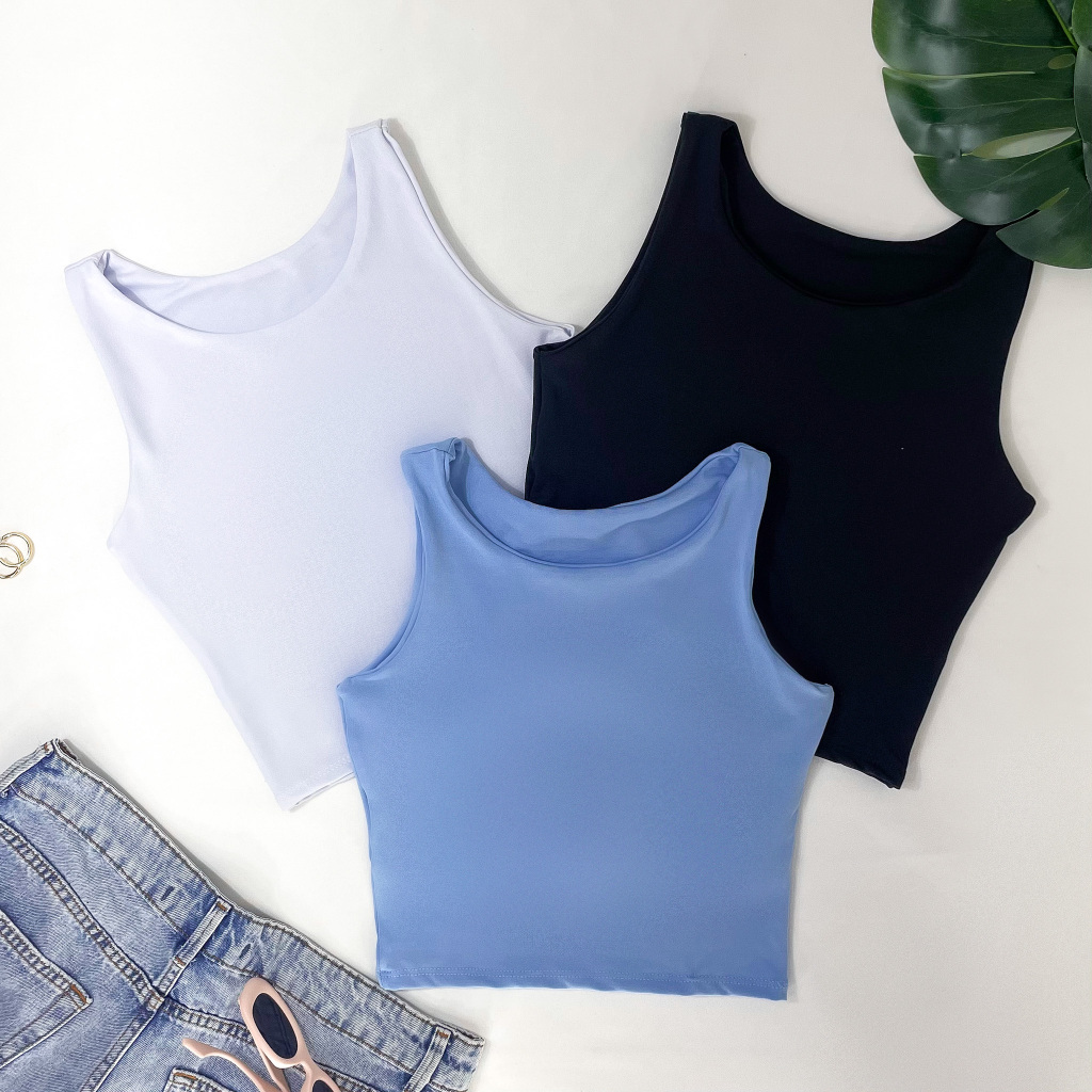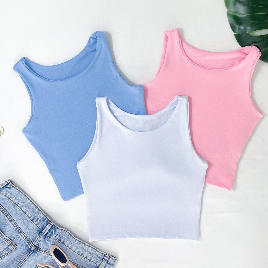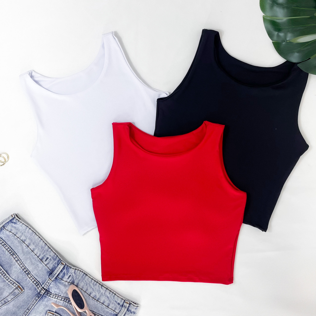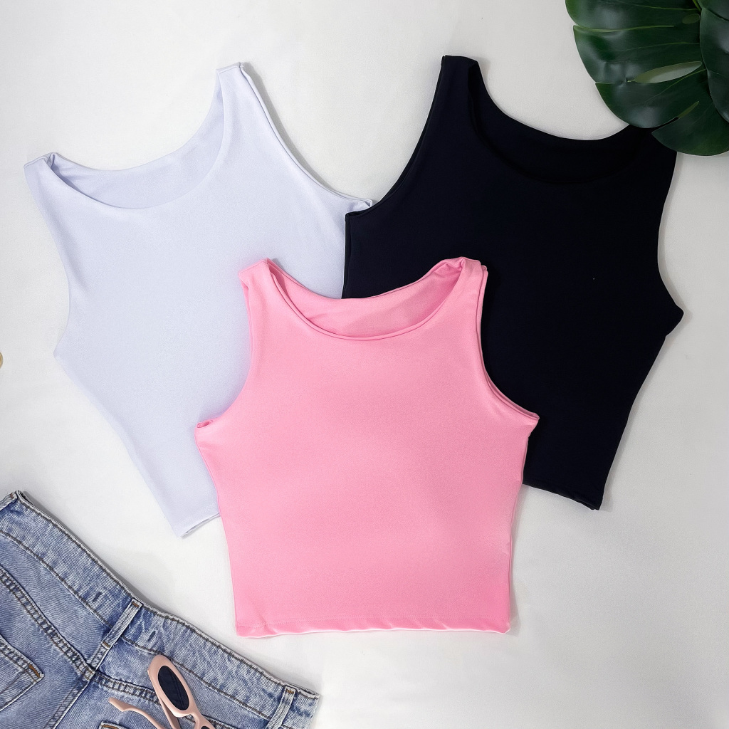 Kit 3 Cropped Feminino Top Regata Liso Básico Suplex Forro Duplo