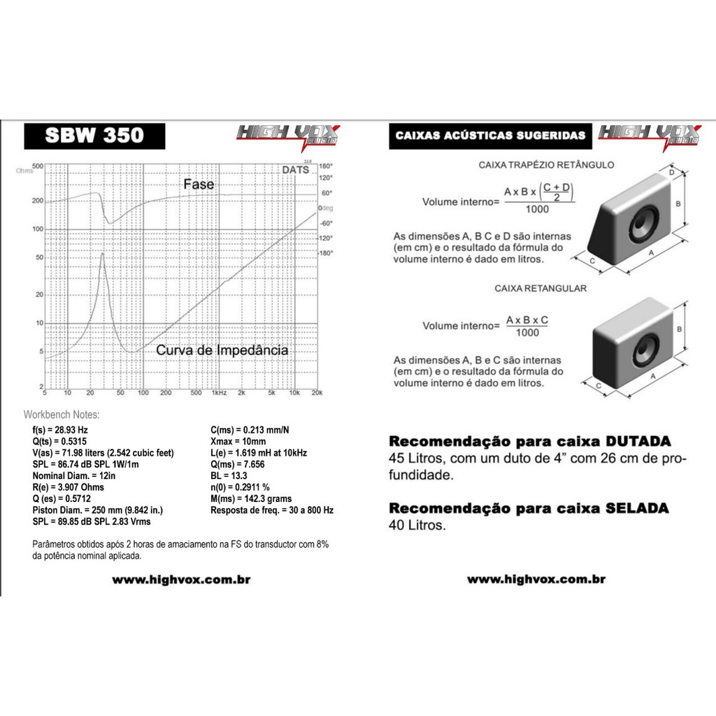 Alto Falante Tormento Sub Woofer 12 Pol Sbw 350 Wrms 4+4 Ohm