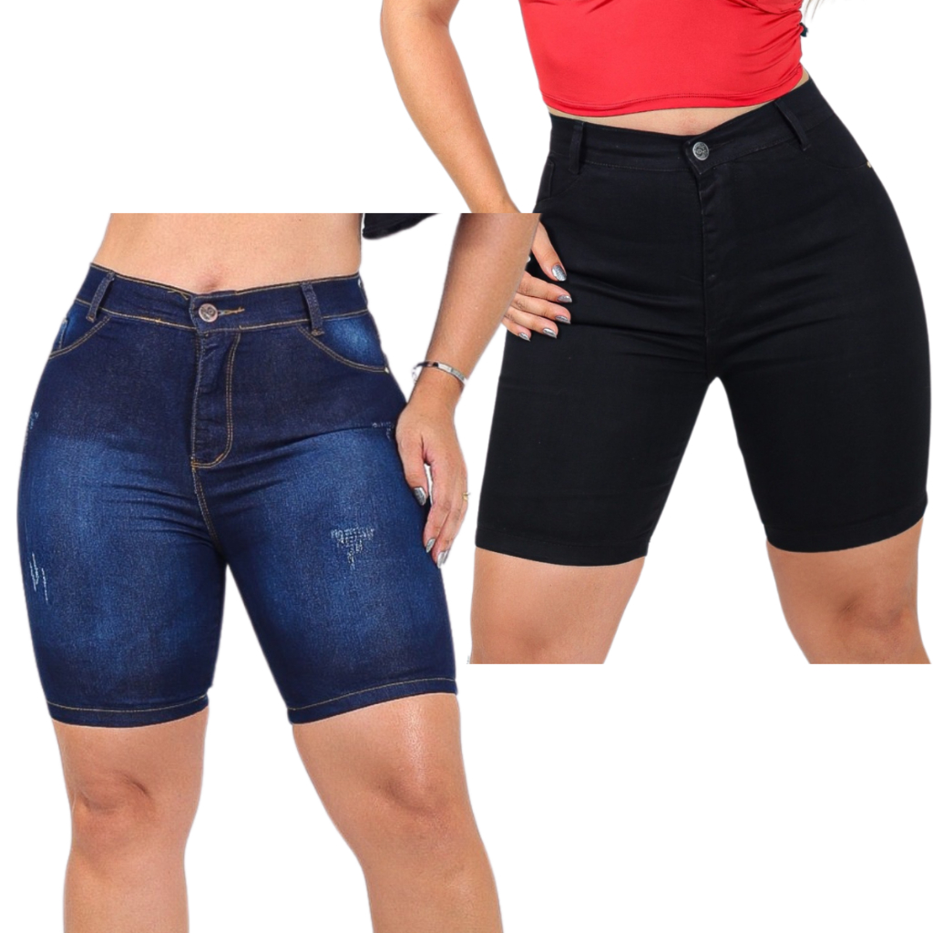 Kit 2 Bermudas Jeans Feminina Meia Coxa Cintura Alta Lycra Modelagem Levanta Bumbum