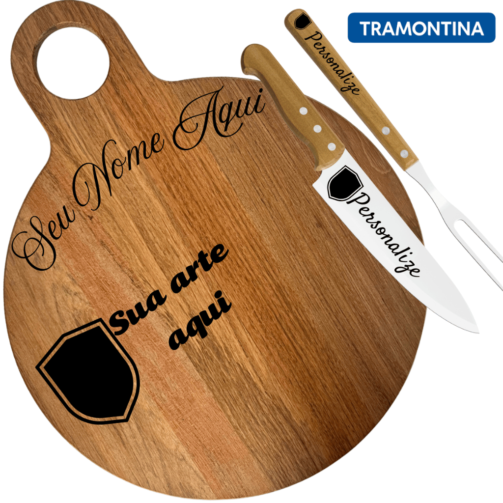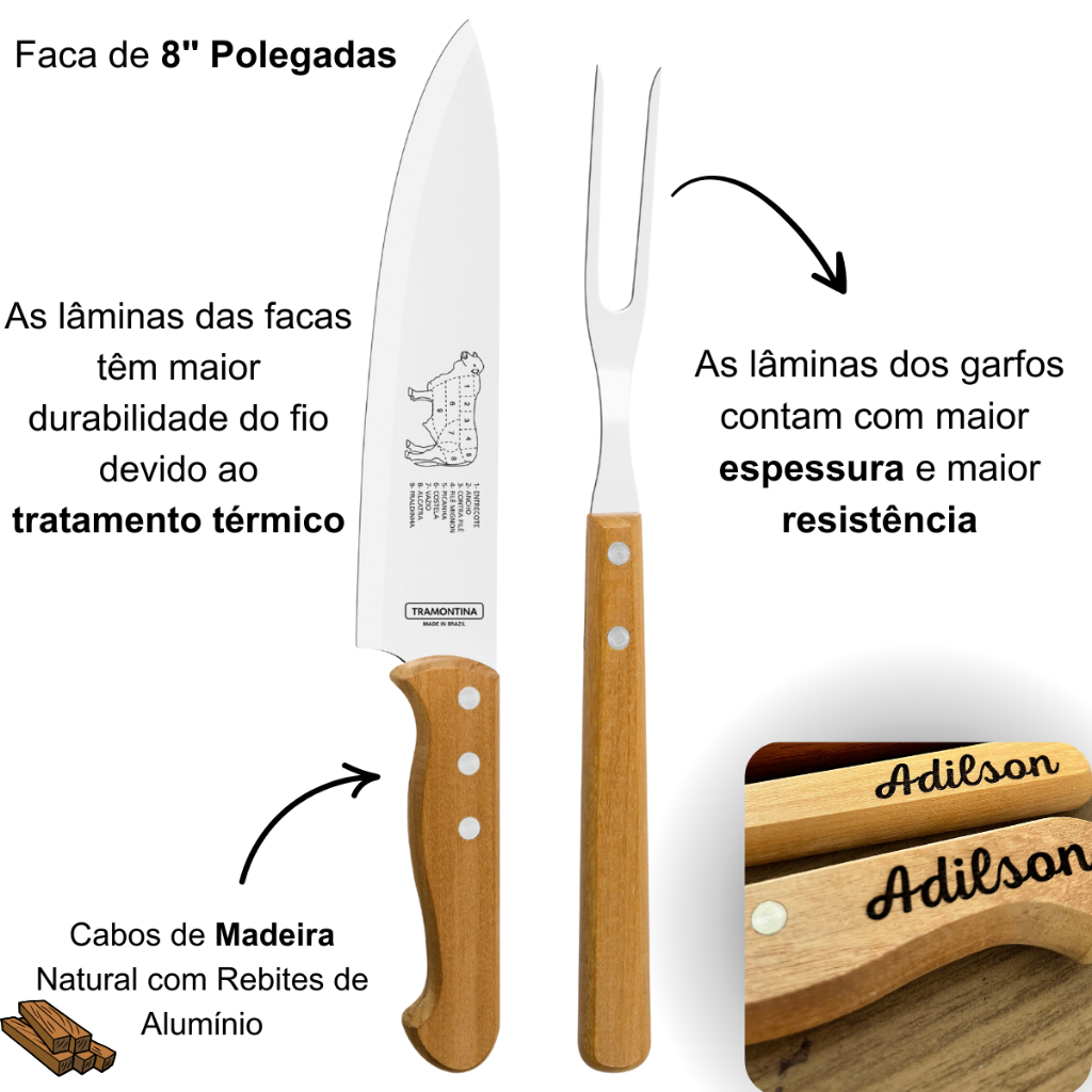Kit Tramontina Tábua de Madeira Garfo e Faca para Churrasco Personalizado Nome Logo Time Presente