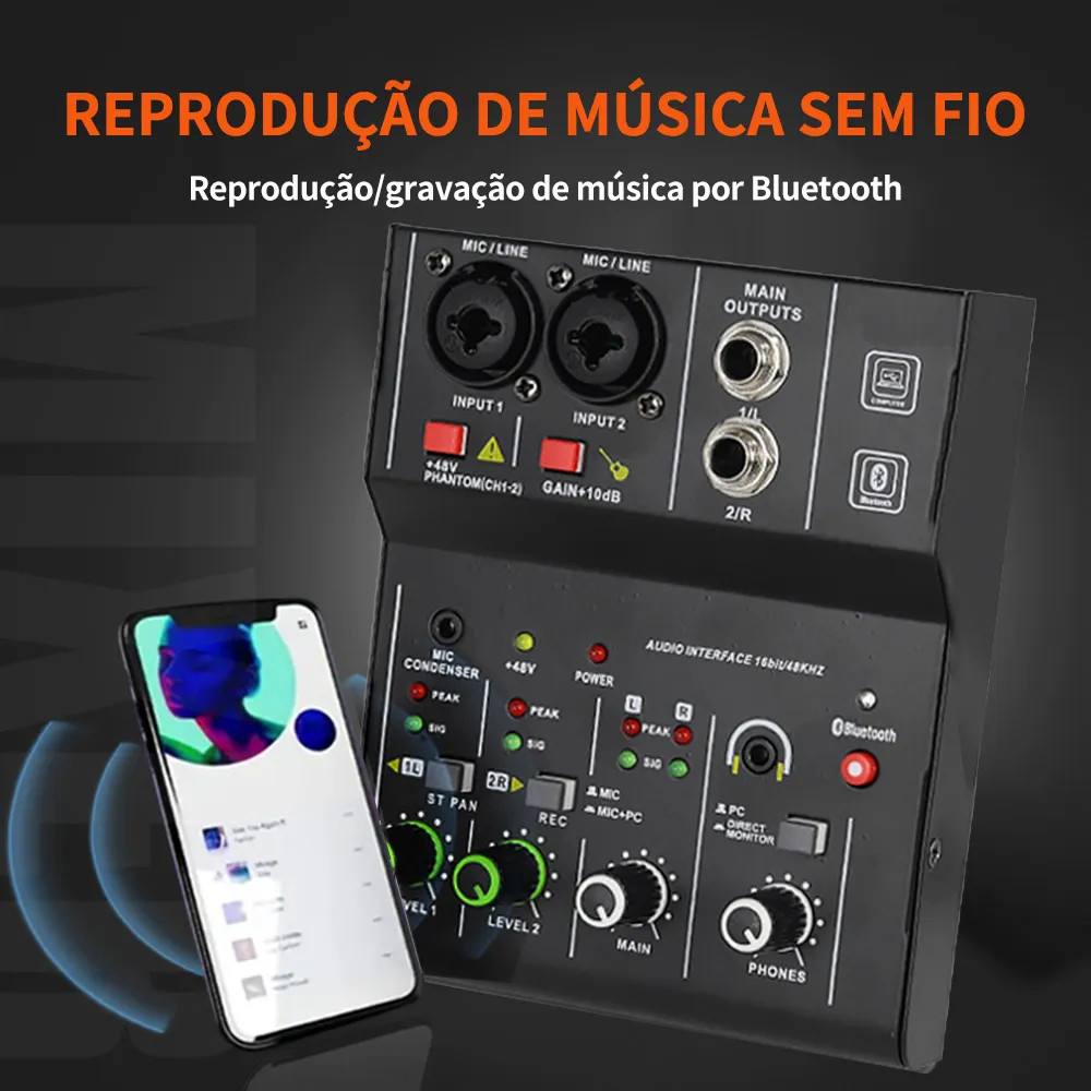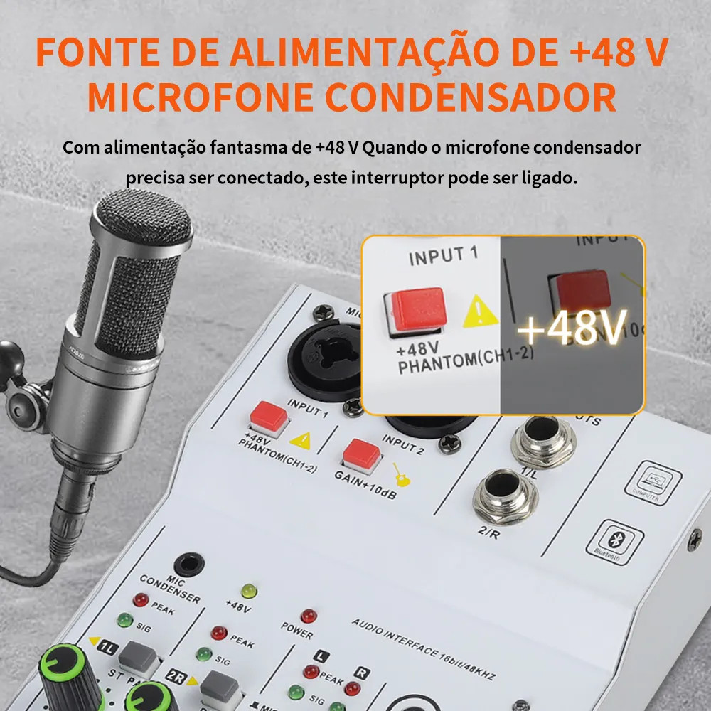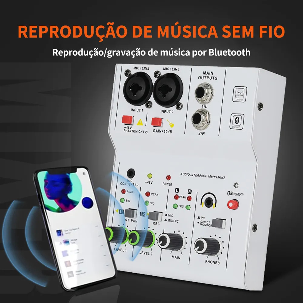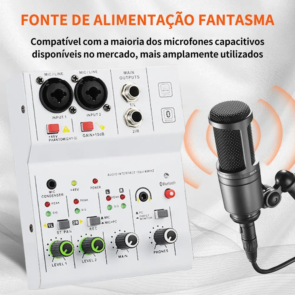 Misturador de Áudio 2 Canais Interface de Áudio com Bluetooth +48V Fonte Fantasma para Gravação e Live