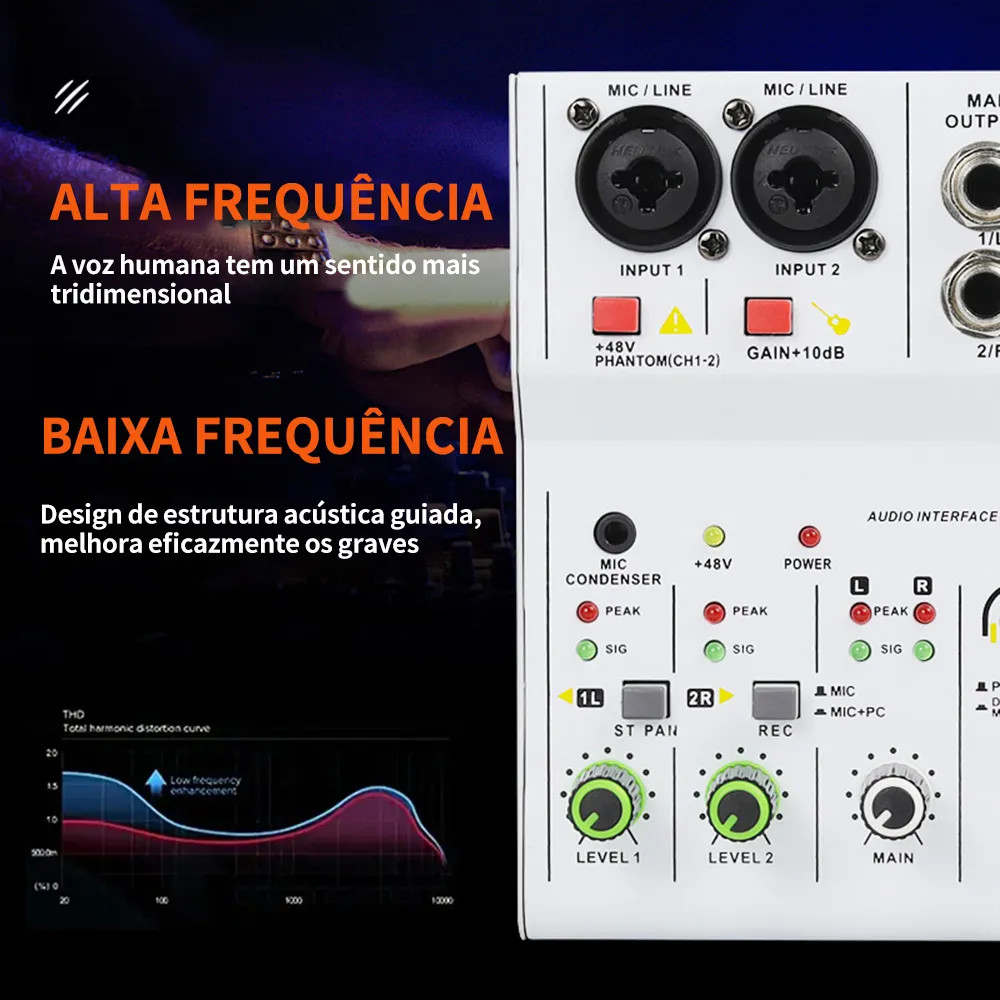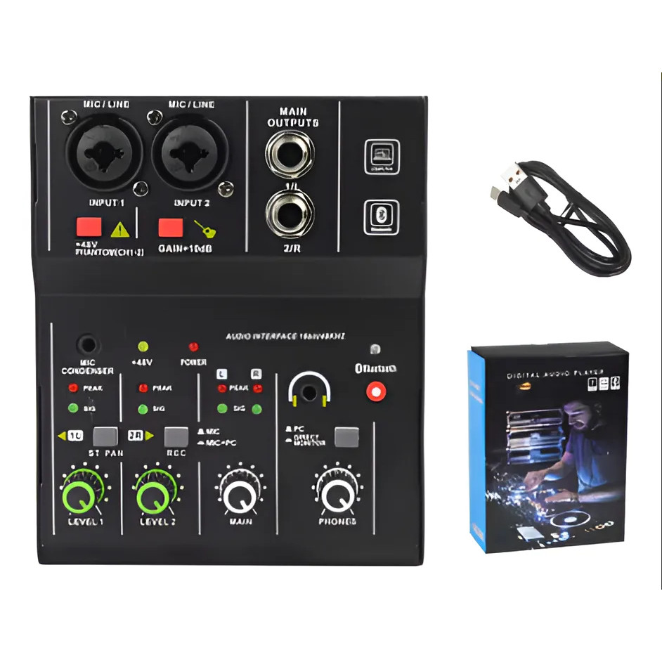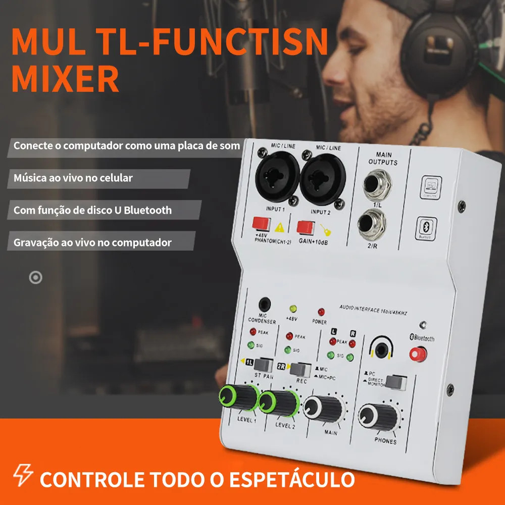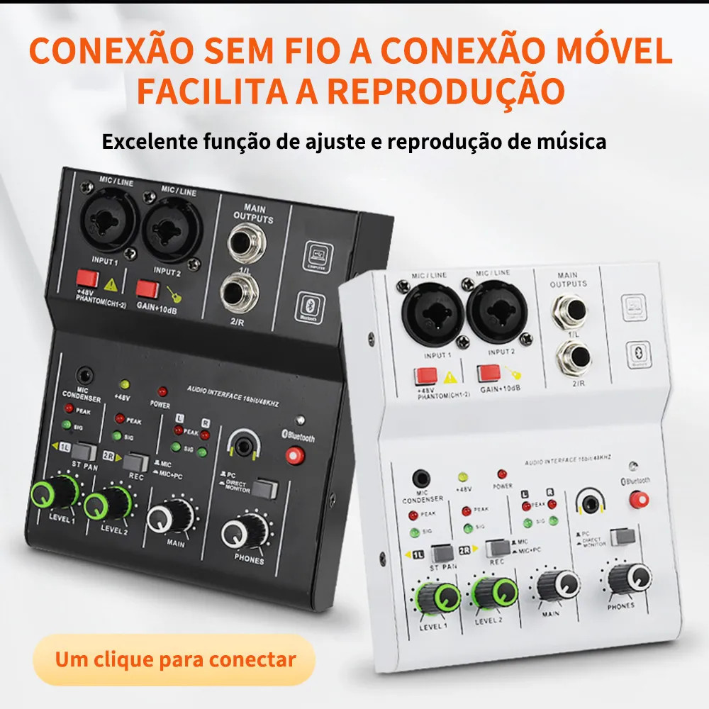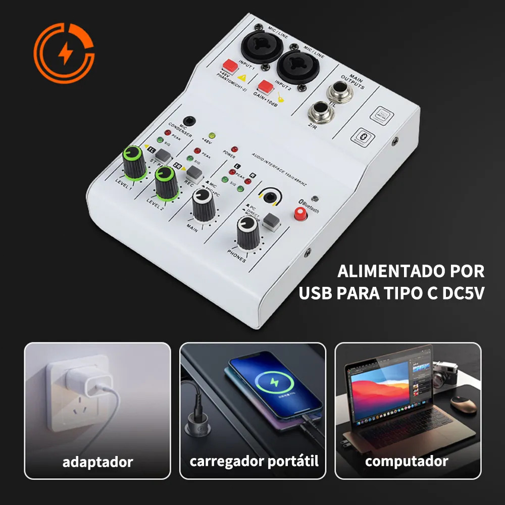 Misturador de Áudio 2 Canais Interface de Áudio com Bluetooth +48V Fonte Fantasma para Gravação e Live