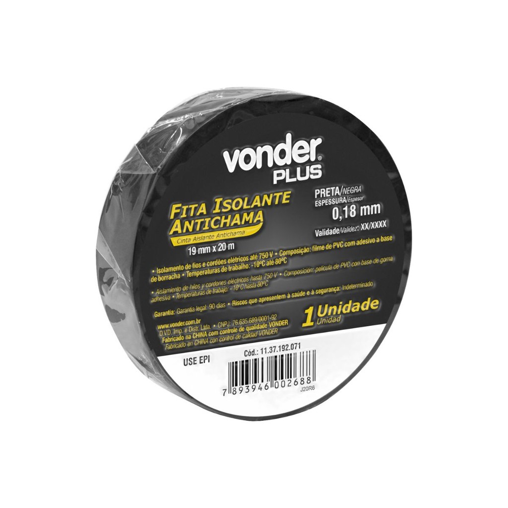 Fita isolante antichama cor preta 19mmx20m VONDER PLUS