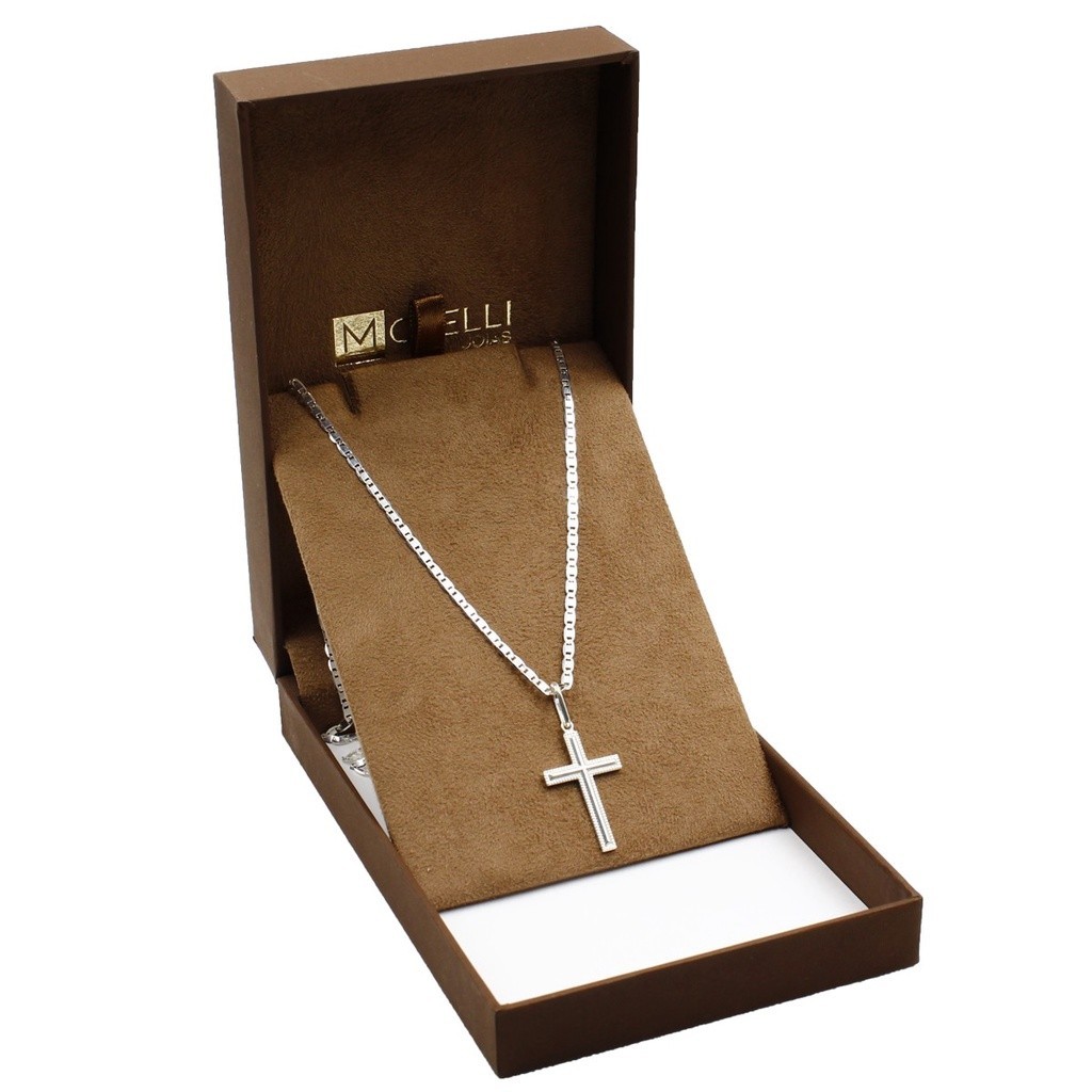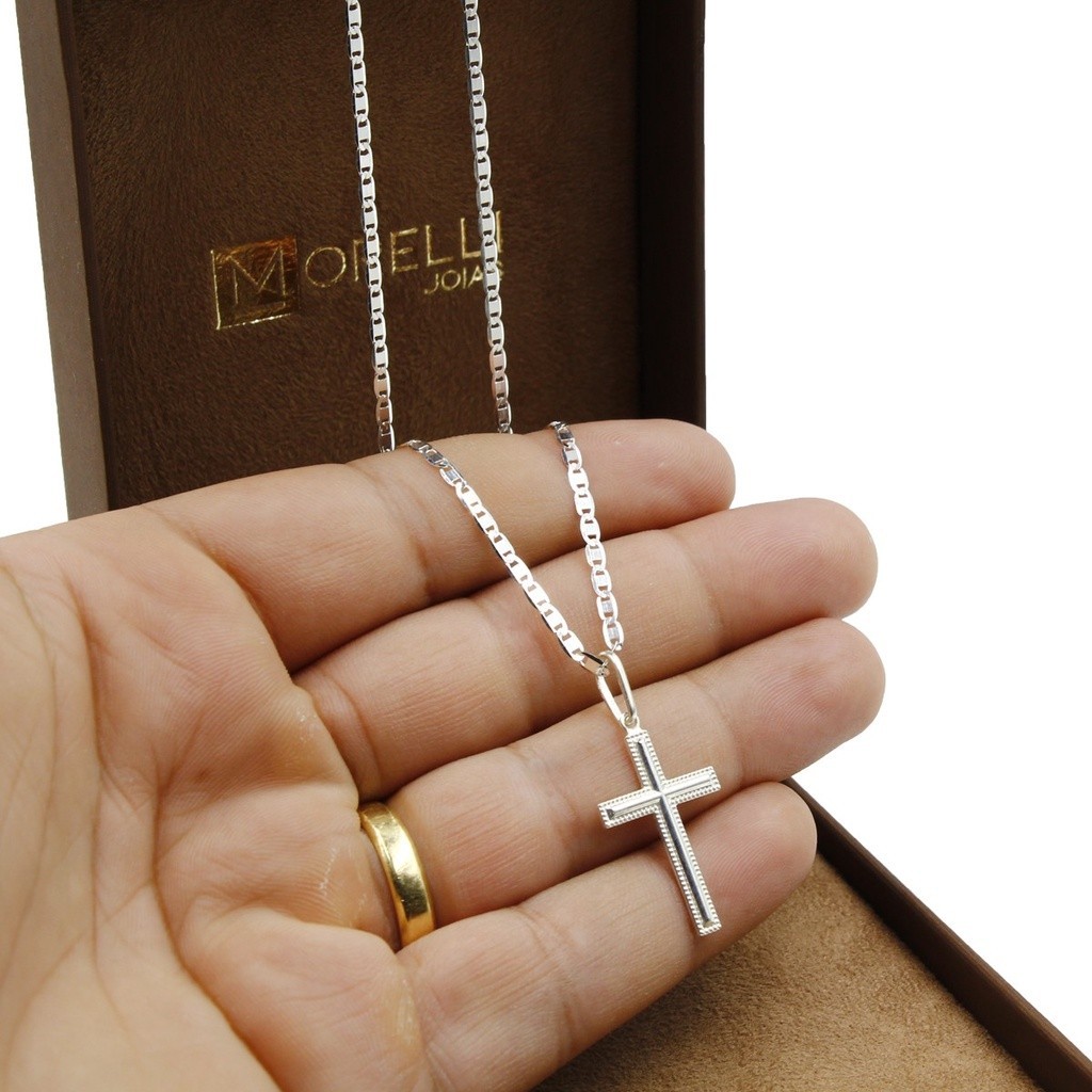 Corrente De Prata 925 Piastrine 60cm pingente cruz Meio Liso