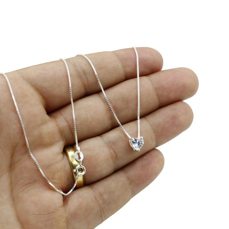 Corrente Colar De Prata 925 Feminino Veneziana 50cm Pingente ponto de luz Coração 6mm