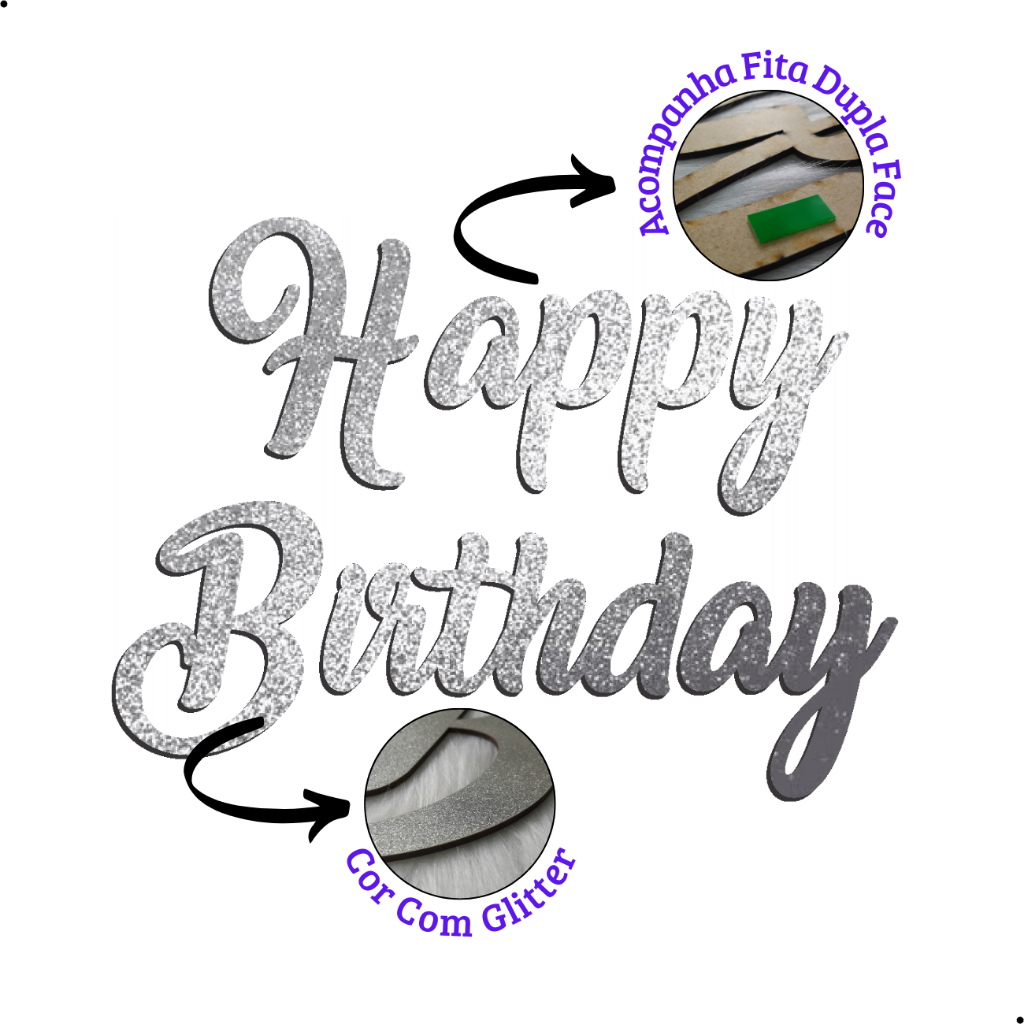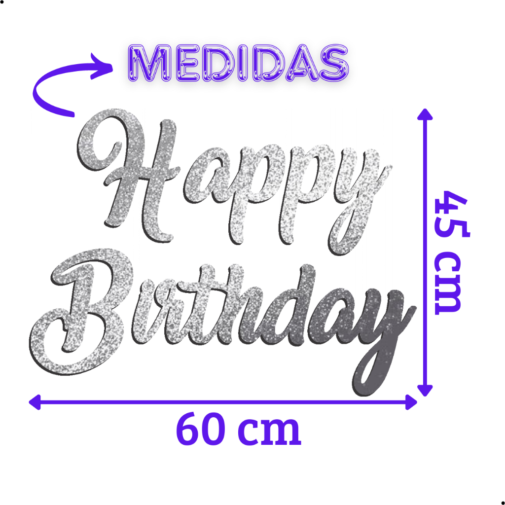 Aplique Letreiro Happy Birthday 60x45cm Cor Prata Glitter Mdf Frase Painel Decorativo Festa Aniversario Decoração