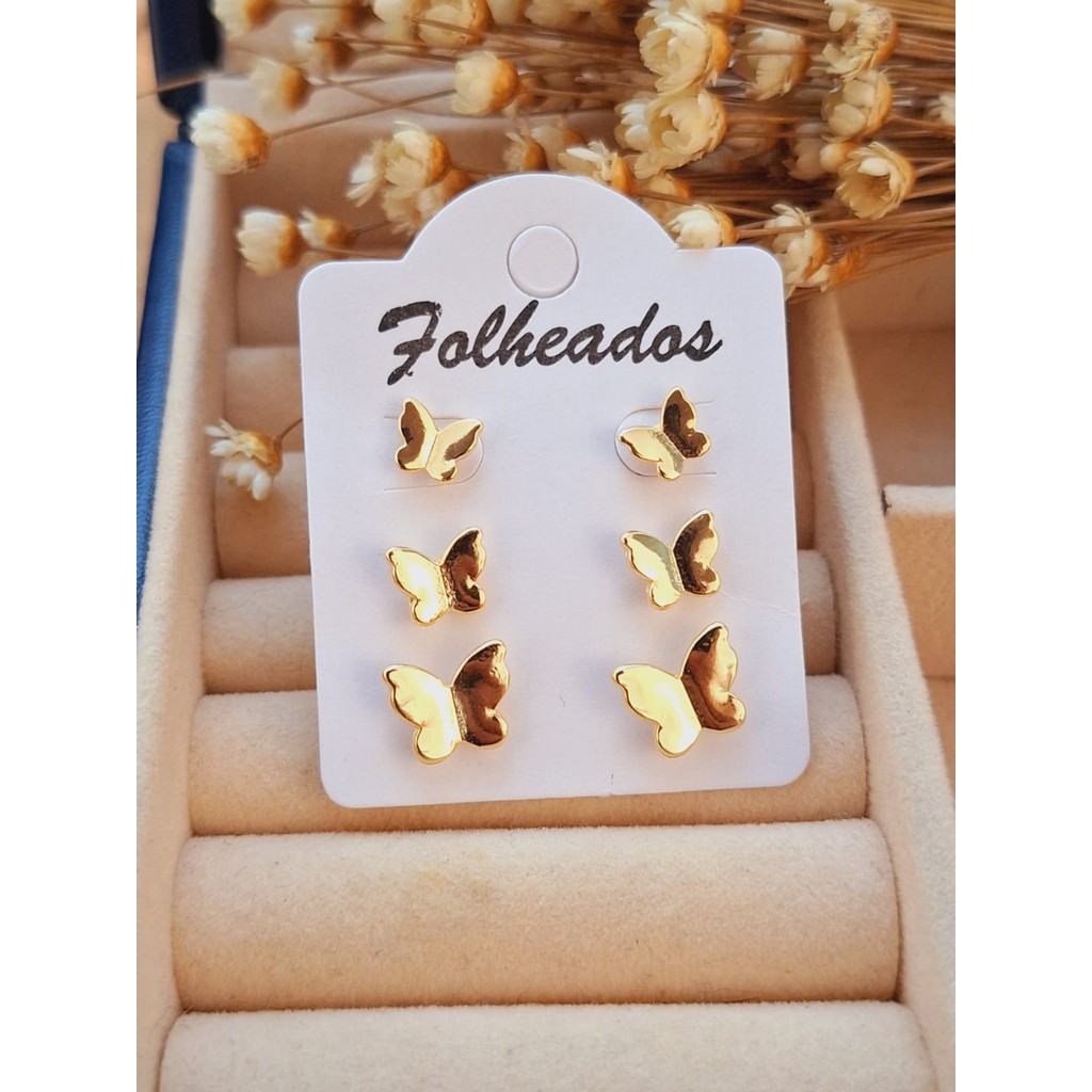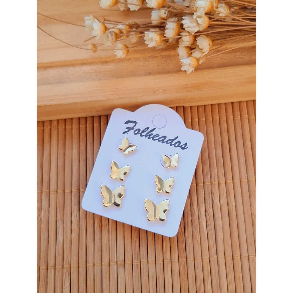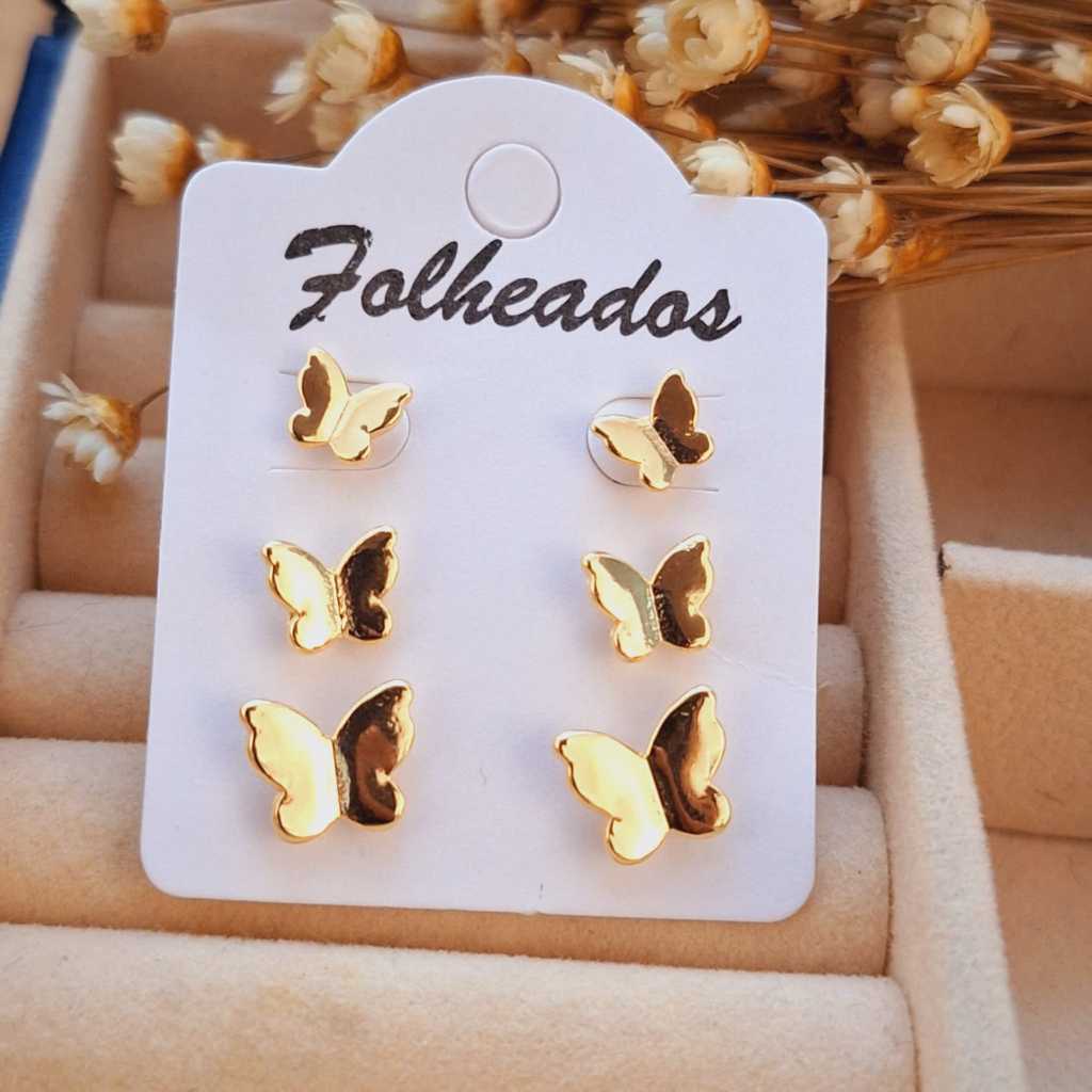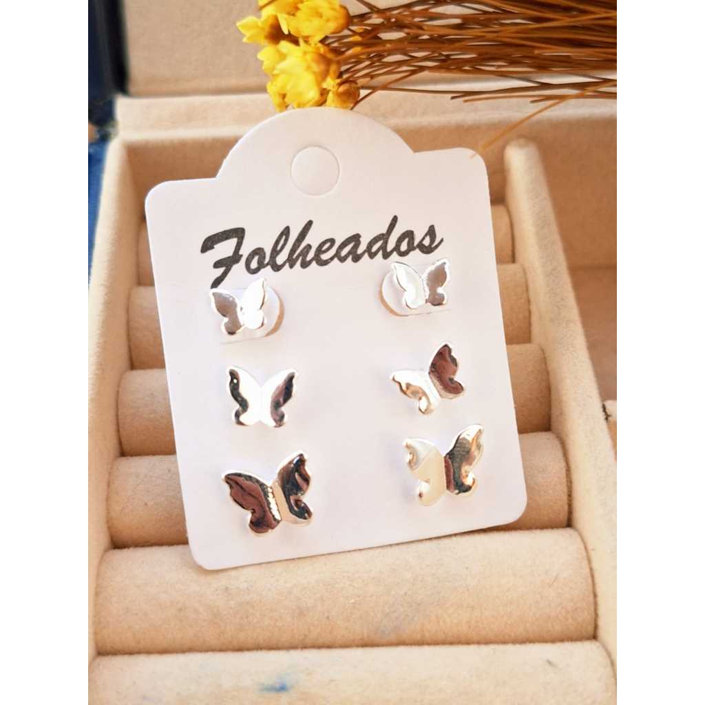 Trio de Brincos Folheado a Ouro - Prata Borboletas