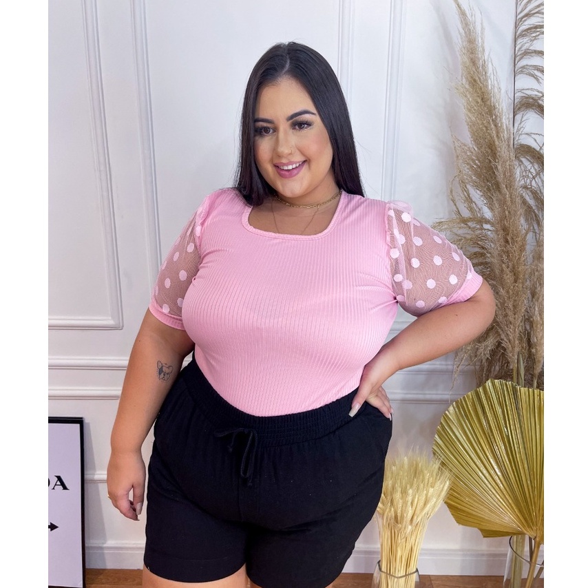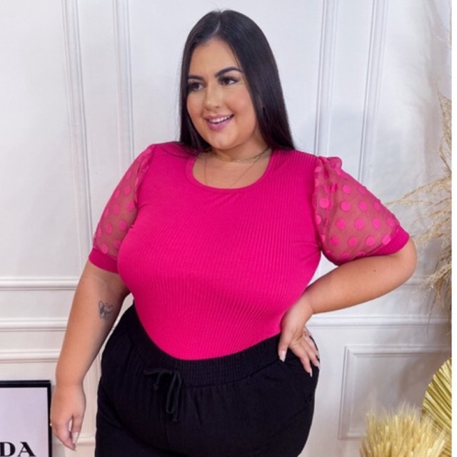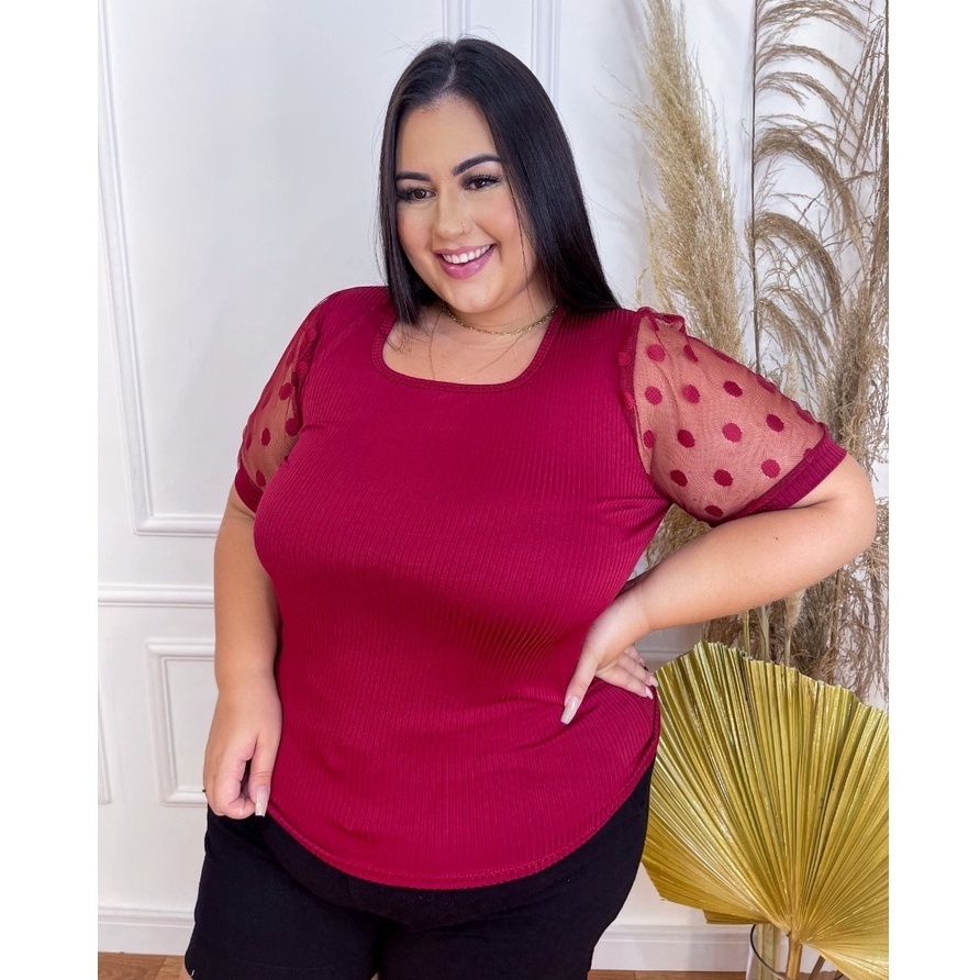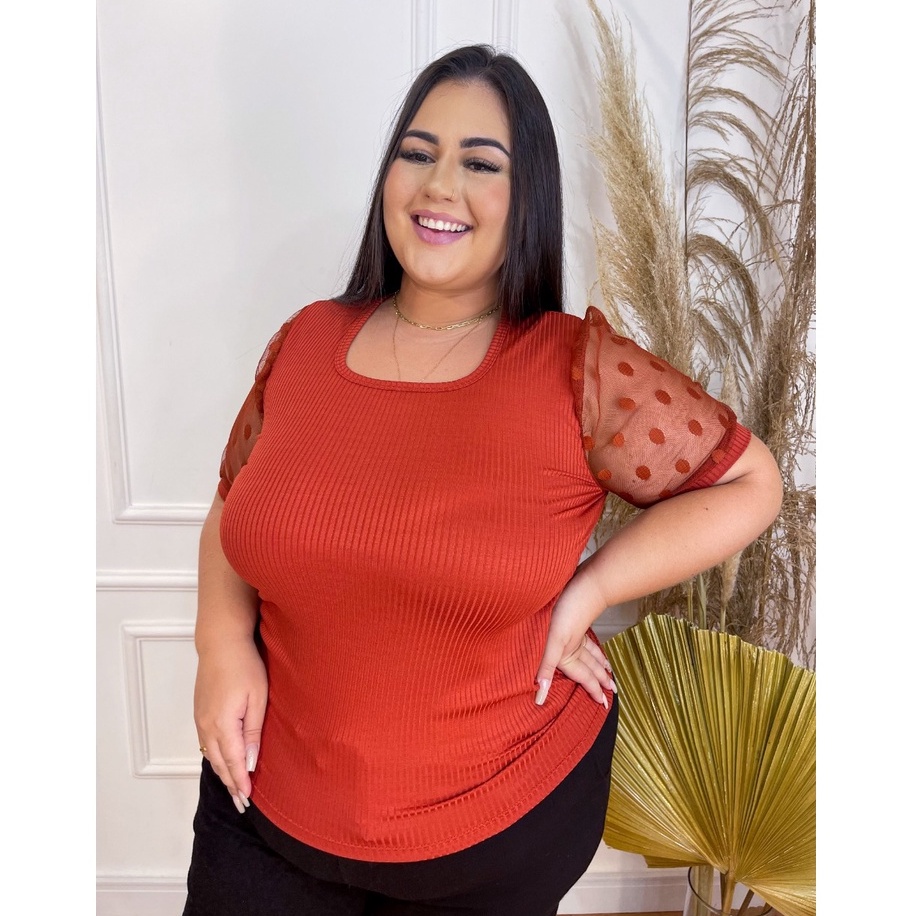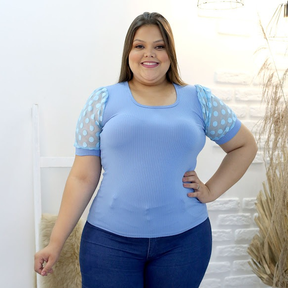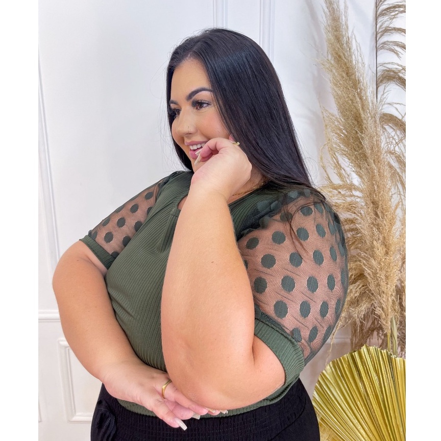 Blusa Plus Size Barata Blusinha Canelada Manga Princesa Tule Poá Bufante Moda Evangélica