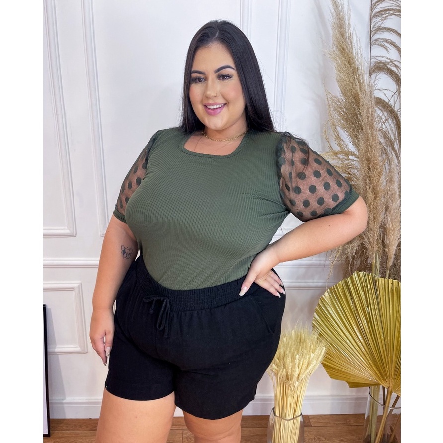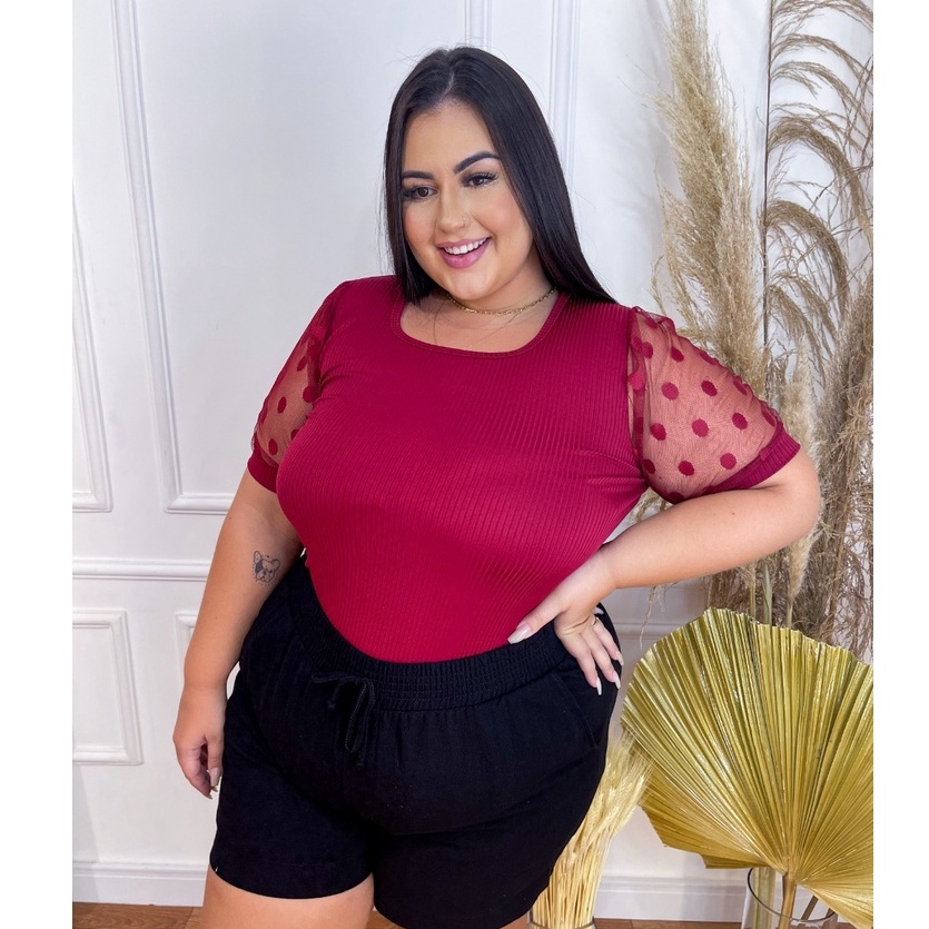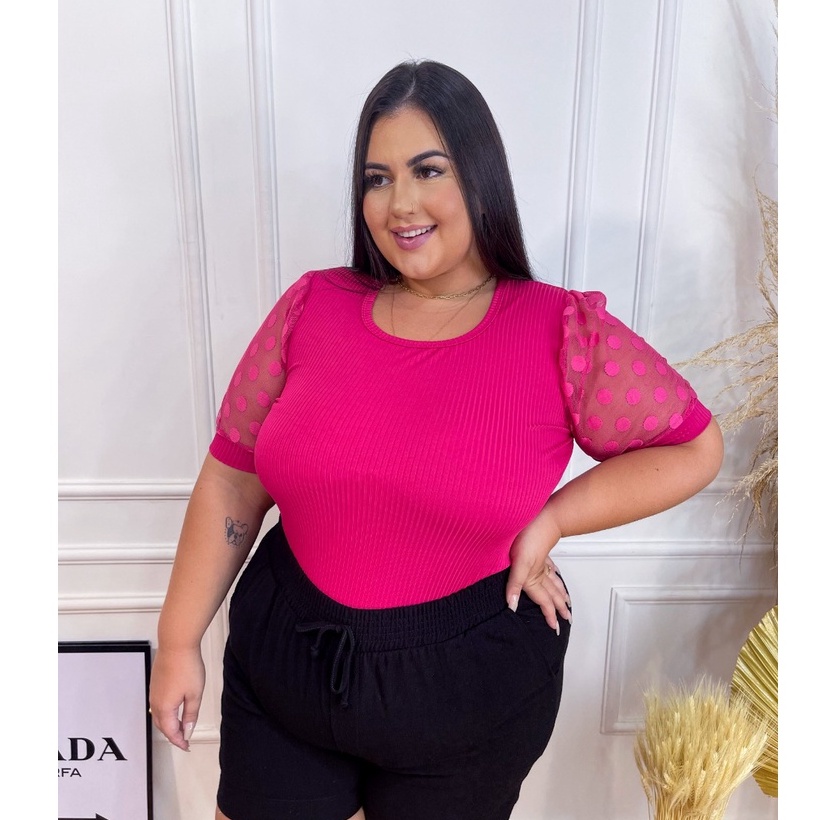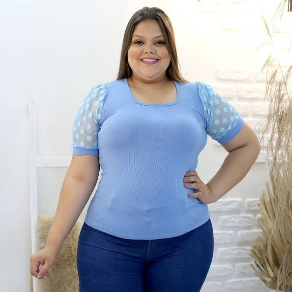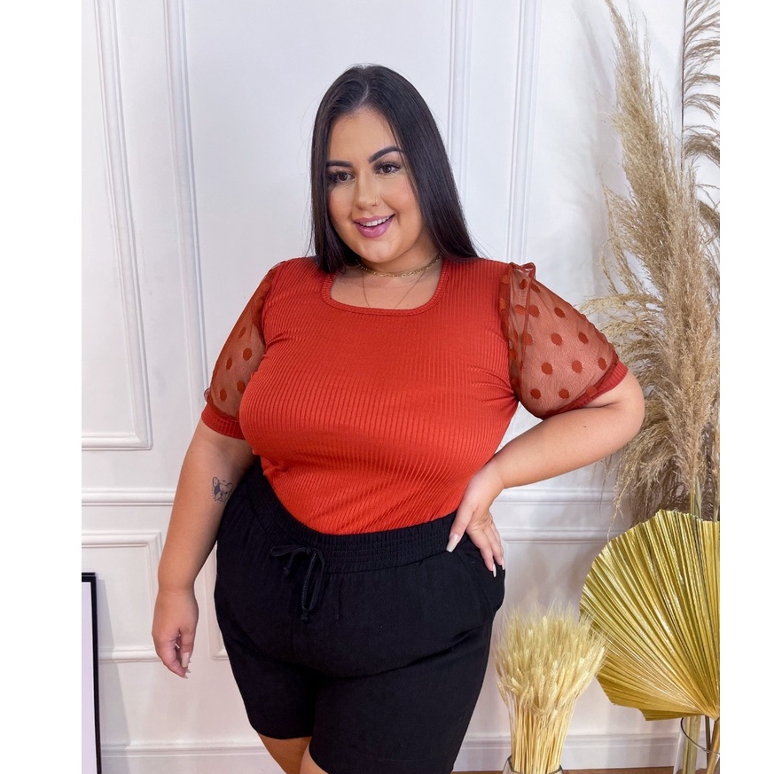 Blusa Plus Size Barata Blusinha Canelada Manga Princesa Tule Poá Bufante Moda Evangélica