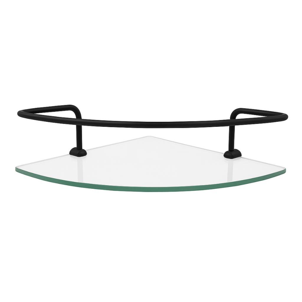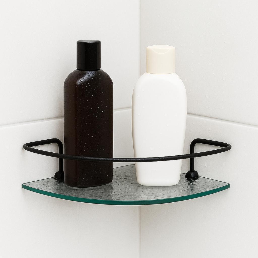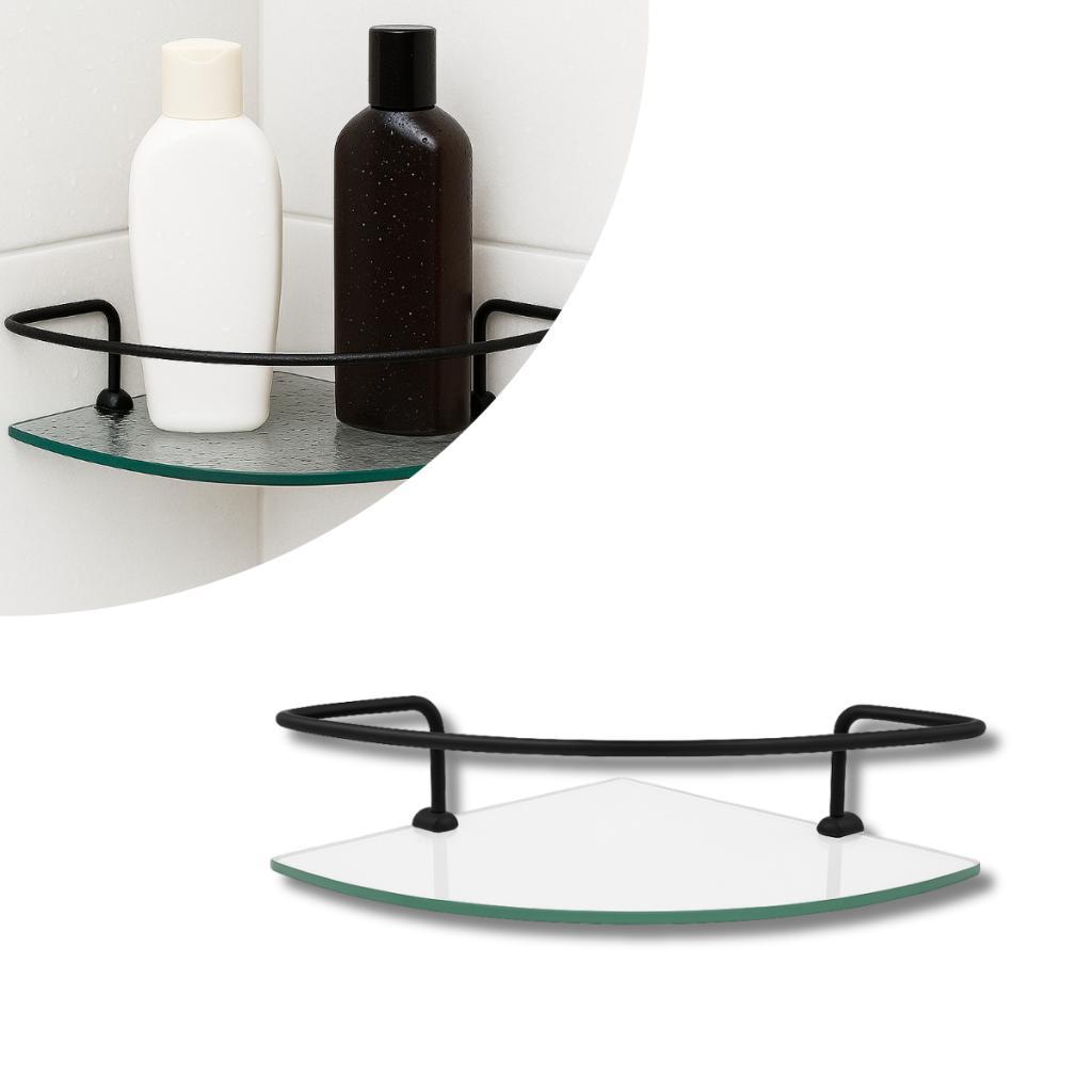 Porta Shampoo Canto 30cm Vidro Incolor Haste e Suporte Fixação Preto Fosco Dupla Fixação Prateleira