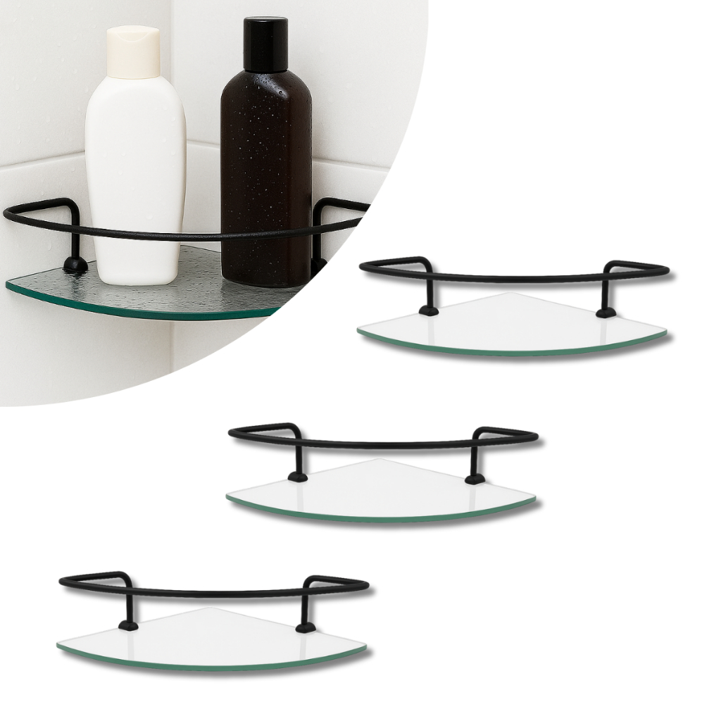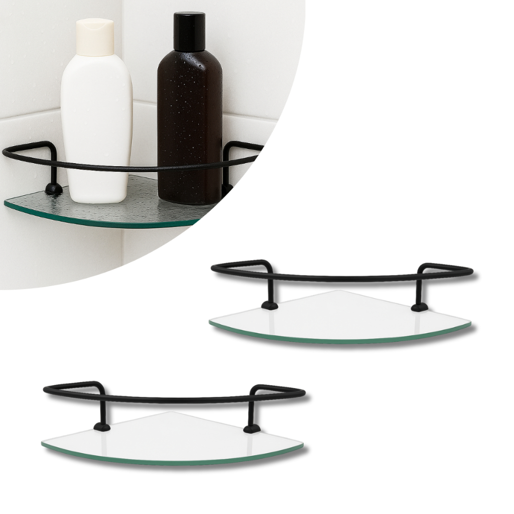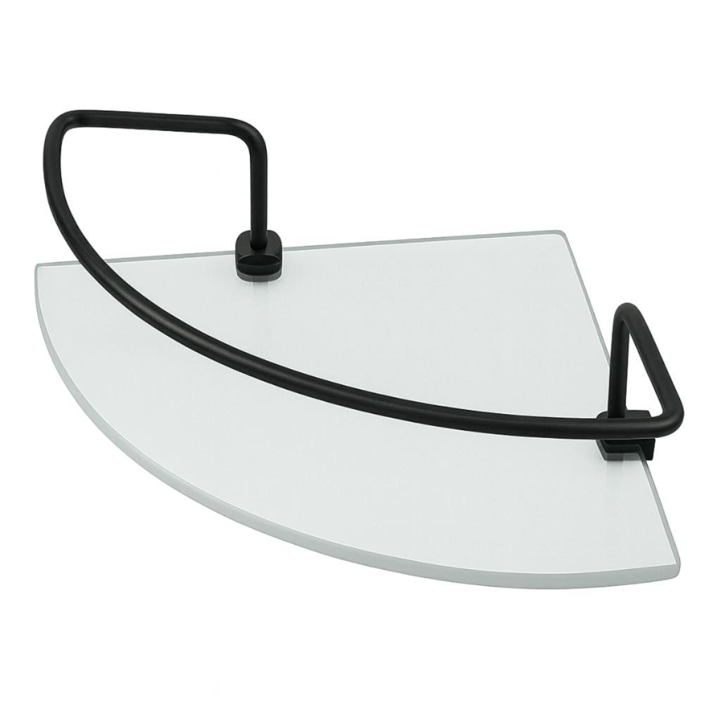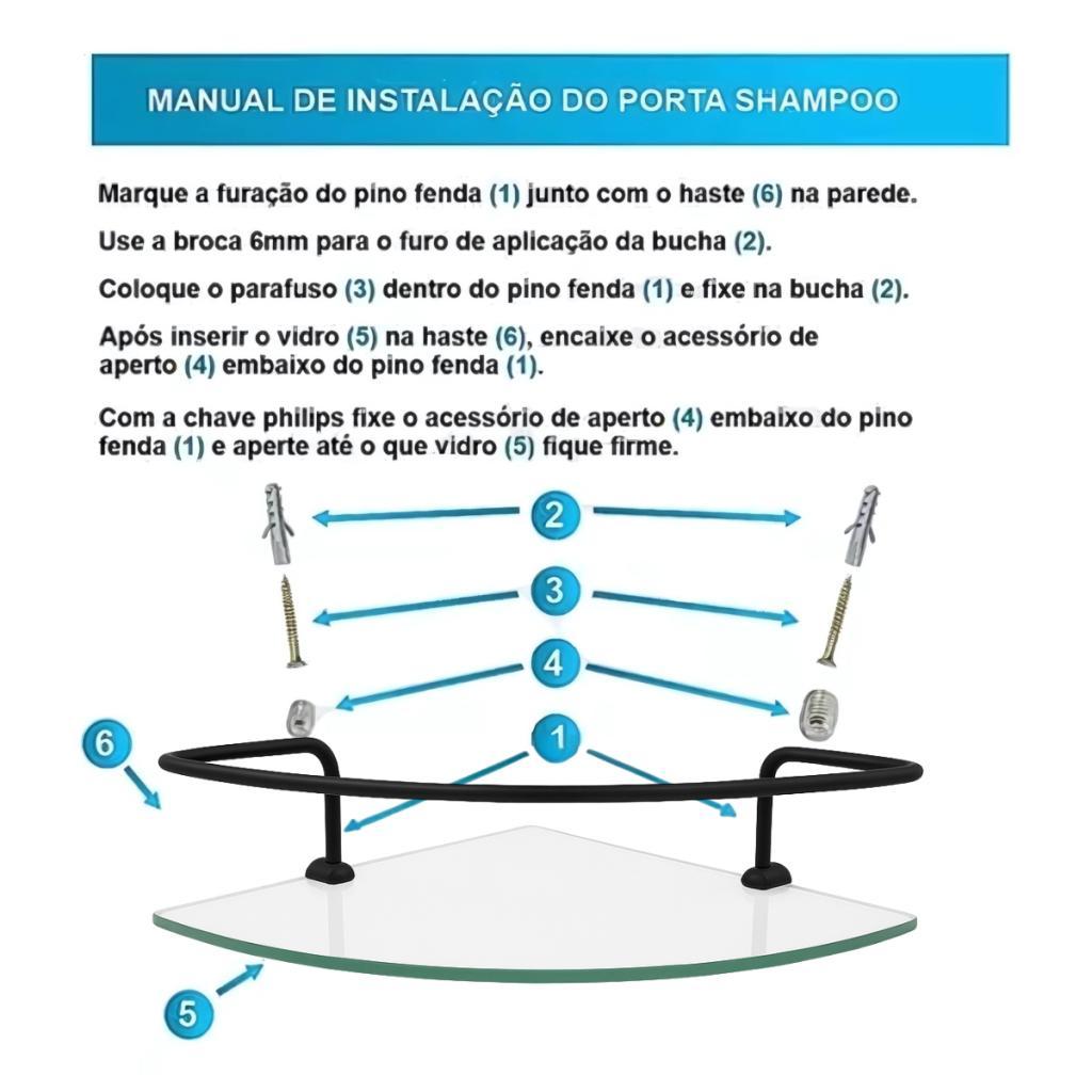 Porta Shampoo Canto 30cm Vidro Incolor Haste e Suporte Fixação Preto Fosco Dupla Fixação Prateleira