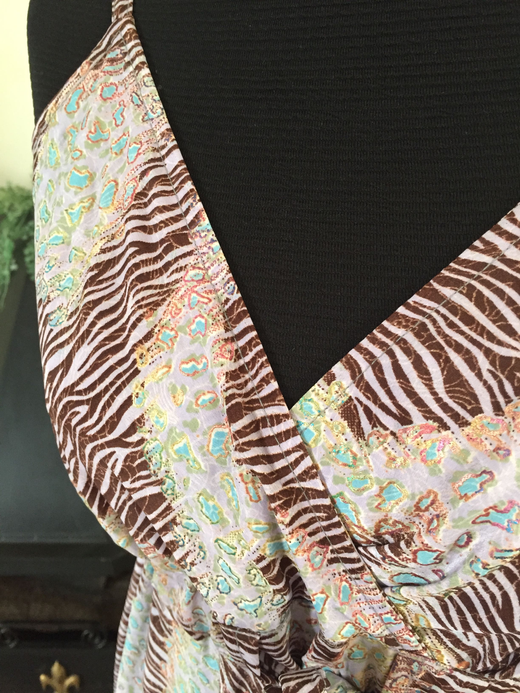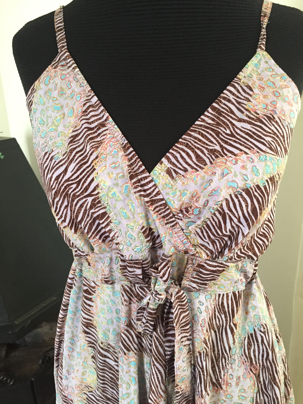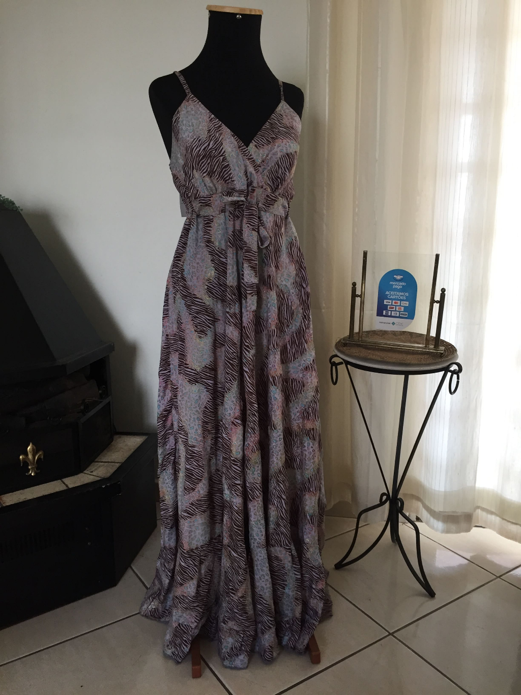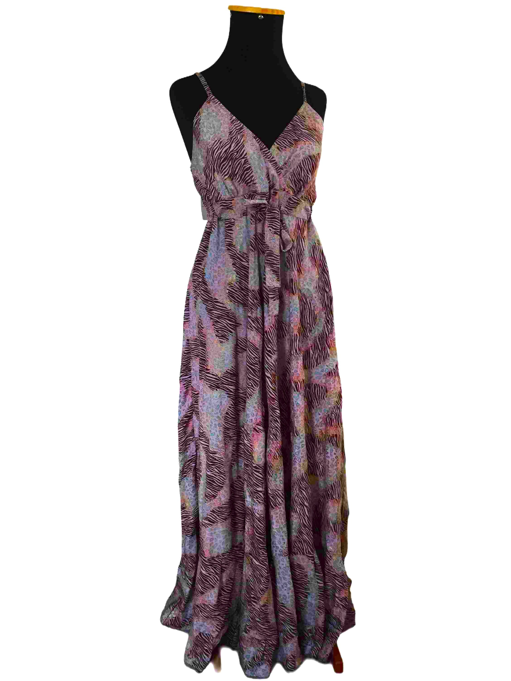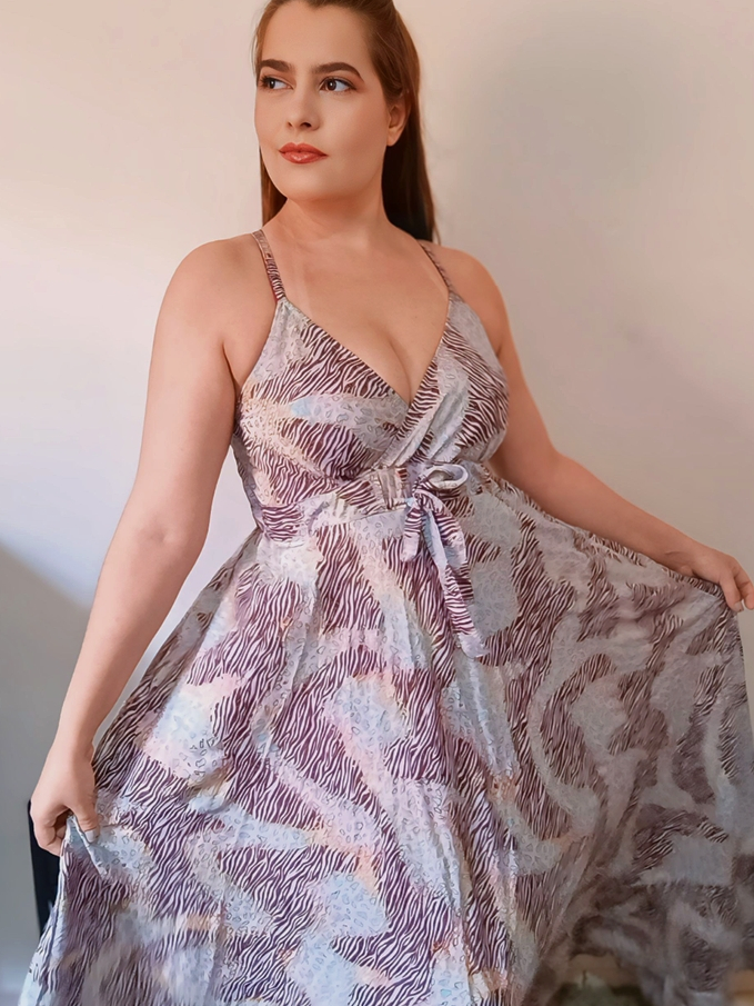 Vestido Longo com Brilho Frutacor e Animal Print de Alça Fina com Amarração Frontal