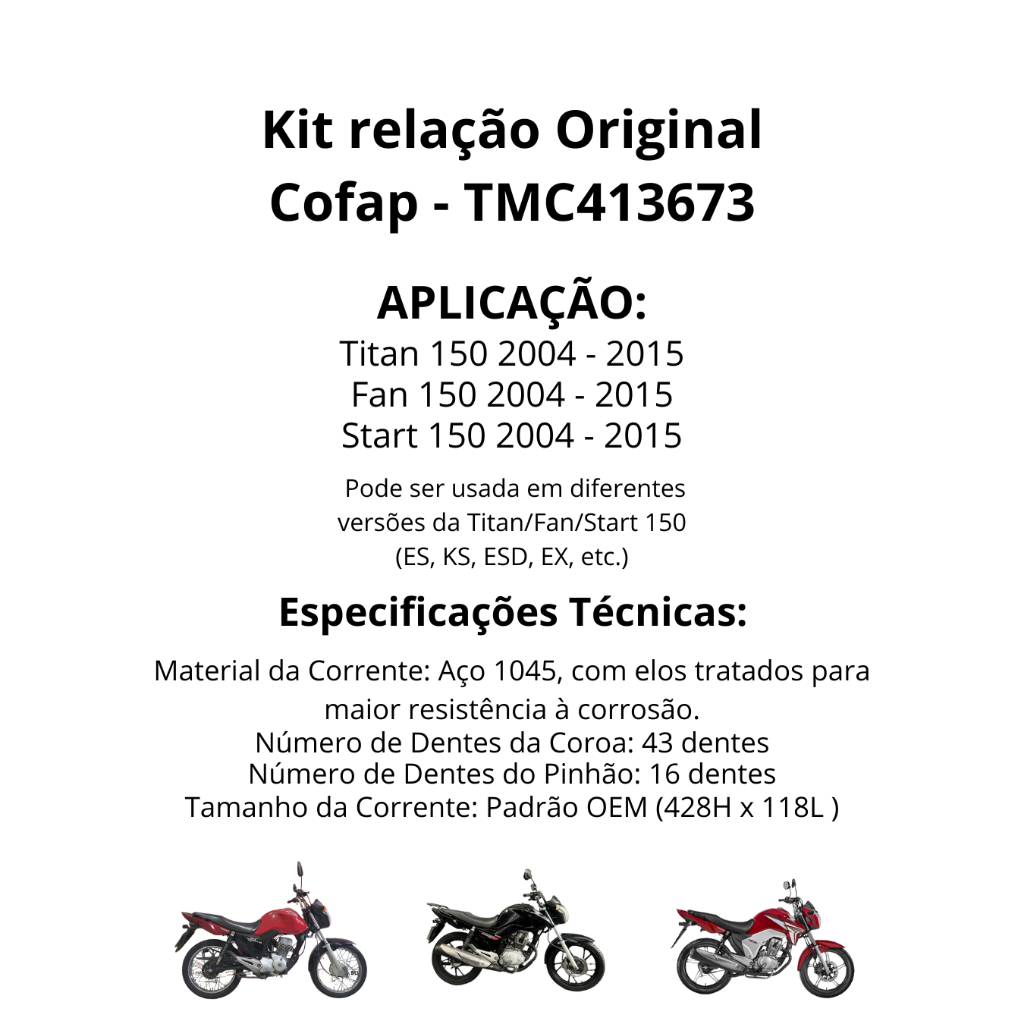 Kit Relação Transmissão CG Titan Fan 150 2004 2005 2006 2007 2008 2009 2010 2011 2012 2013 2014 2015