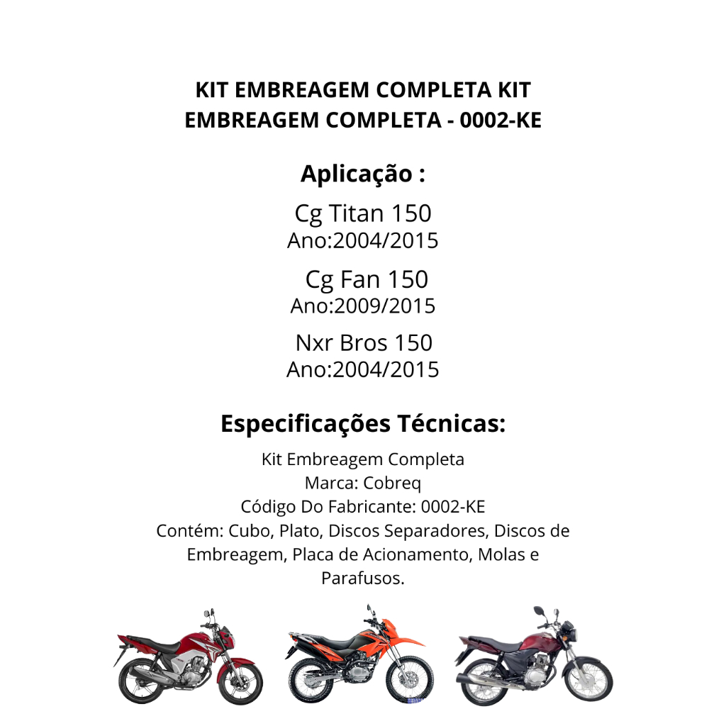 Kit Embreagem Completo Honda Titan 150 Fan 150 Bros 150 2004 A 2015 Fan 125 2009-2016 Cobreq